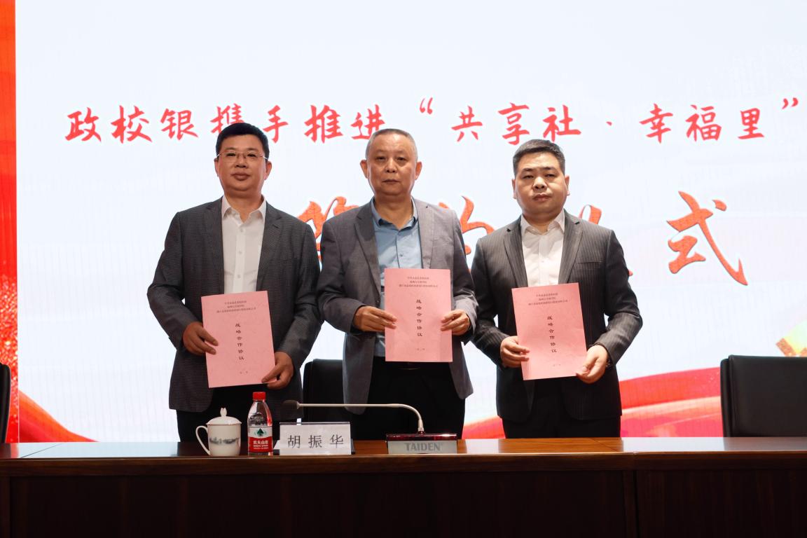 在金融工程系老师及员工的见证下,永嘉县委组织部副部长虞建周、永嘉农商银行董事长徐剑杰与3044永利经理胡振华签订三方战略合作协议,并为老员工“共享社·幸福里”项目实践基地进行揭牌仪式。