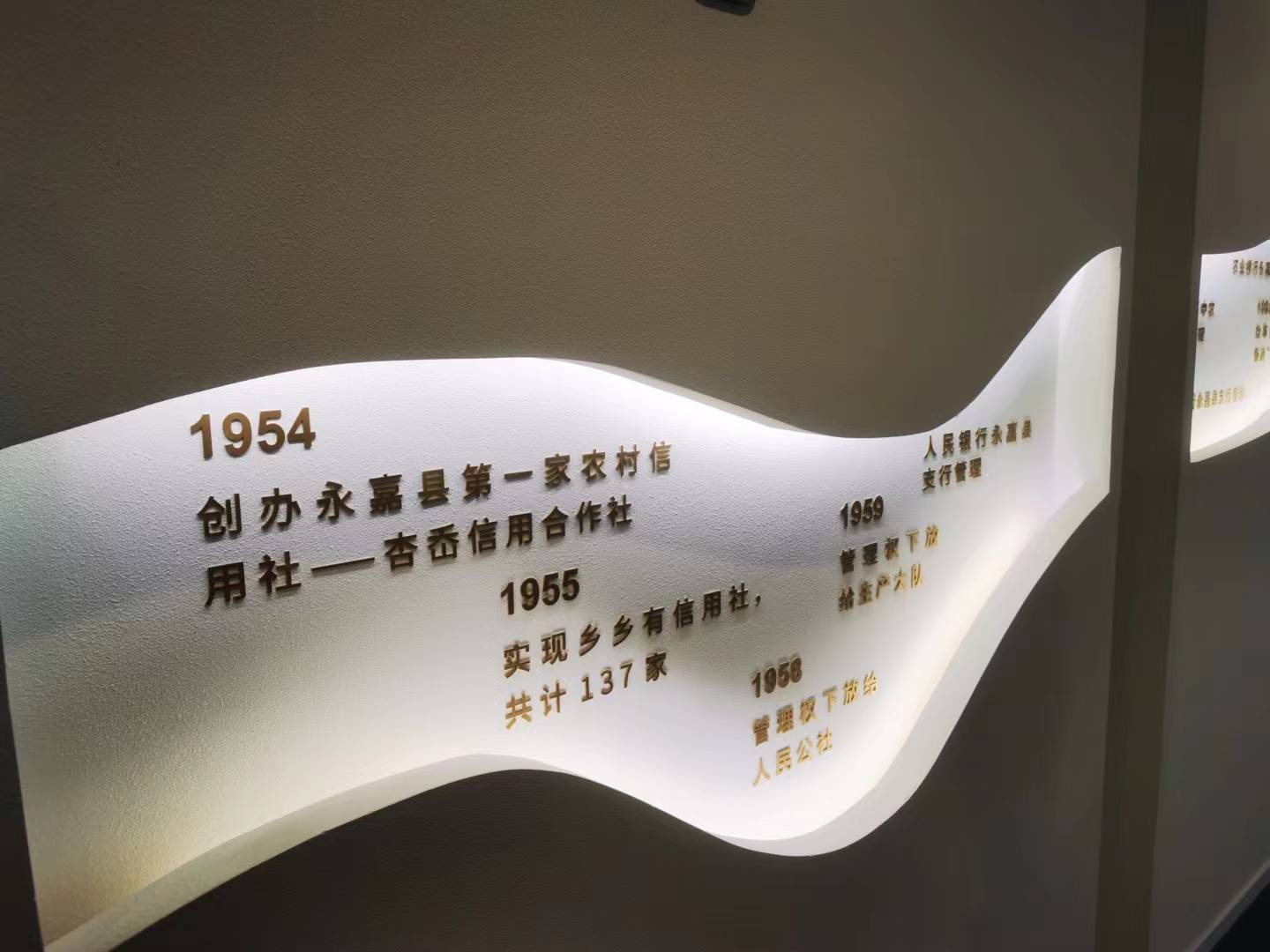 永嘉农商银行总部大楼专设了11层来展示永嘉农商银行的发展历程,那刻印在墙壁上的时间线图也同样刻印在每一个银行工作人员心中,永嘉农商银行起源于1954年,永嘉县第一家农村信用社——杏岙信用合作社,70年的岁月,或有坎坷却从未间断,正如他们对农村发展的支持热情一般得到了一代又一代的延续。