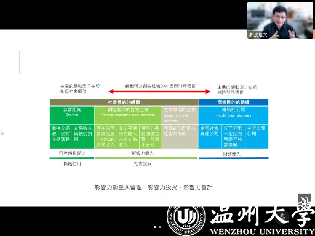 2022年11月9日下午,3044永利工商系在商学楼A222举办教科研系列讲座,会上邀请了中国台湾地区中央大学教授、尤努斯社会企业中心主任沈建文博士做线上学术讲座。