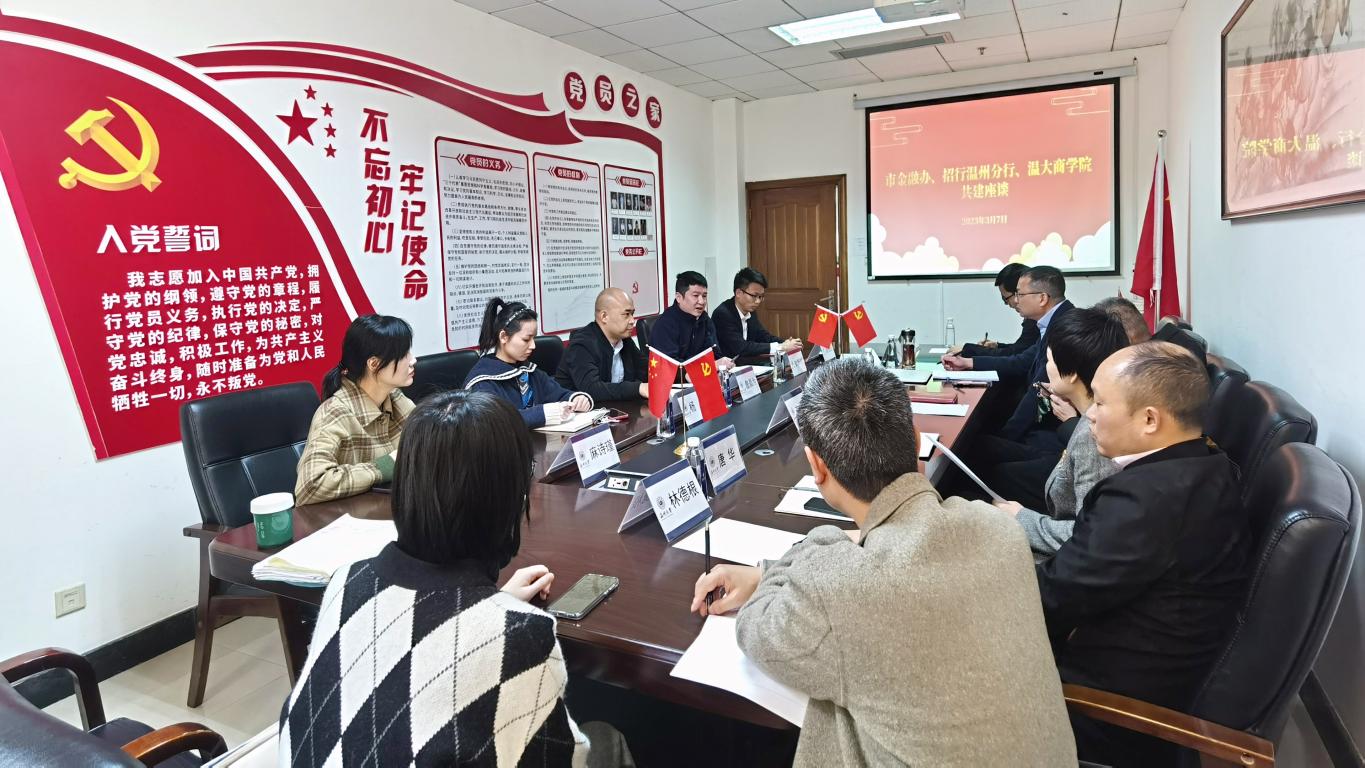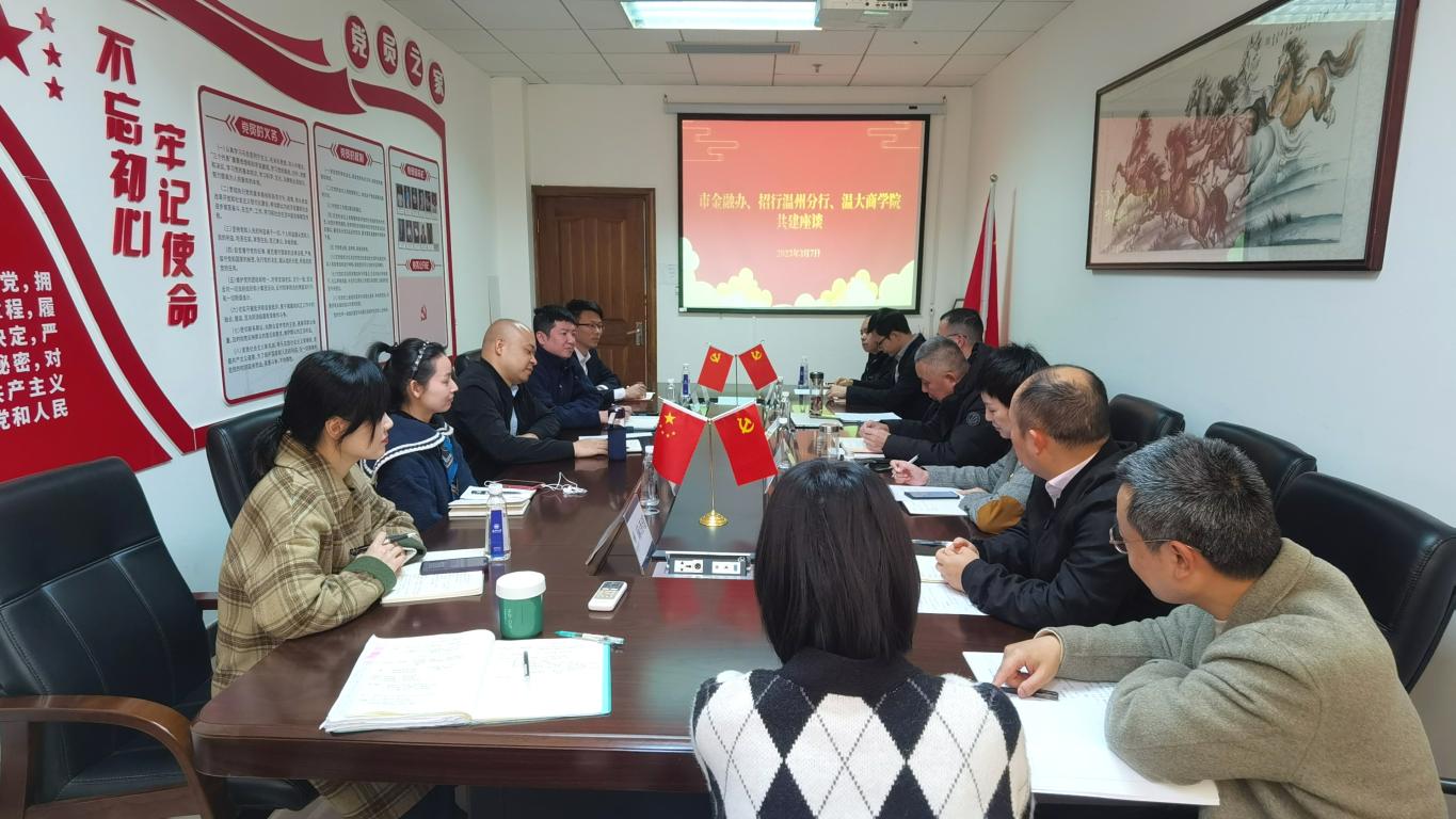 2023年3月7日上午,温州市金融办金融稳定处处长詹昌为等一行2人、招商银行温州分行零售金融事业部总经理刘斯时等一行3人来公司调研交流。3044永利经理胡振华、党委书记李密、金融系教师代表等参加座谈交流活动。双方围绕“银校共建”主题进行了深入会谈。会议由唐华副书记主持。