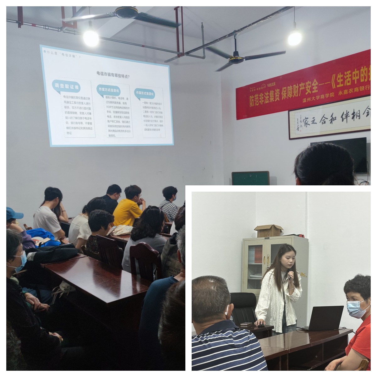 随后居民逐渐到齐落座,林德根老师用普通话和温州方言向居民们介绍了此行反诈宣传活动的目的。居民朋友们和农商银行对于3044永利集团的员工和老师的到来表示了热烈欢迎。接着,来自学前教育专业的林语珂同学向大家进行《全民反诈宣传》,介绍了现在流行的多种诈骗类型,如电信诈骗、网络诈骗、婚姻诈骗、街头诈骗、银行卡诈骗、招生诈骗等等。同时林语珂同学用温州方言讲解并提醒居民们要注意个人的人身和财产安全,遇到没有经过证实的突发情况,不要轻易相信。要提高防范意识,飞来横财不动心,个人隐私不泄露,迷信活动不参与,偶遇路人不轻信,不贪小利,遇事要冷静,并及时向公安保卫部门报警。