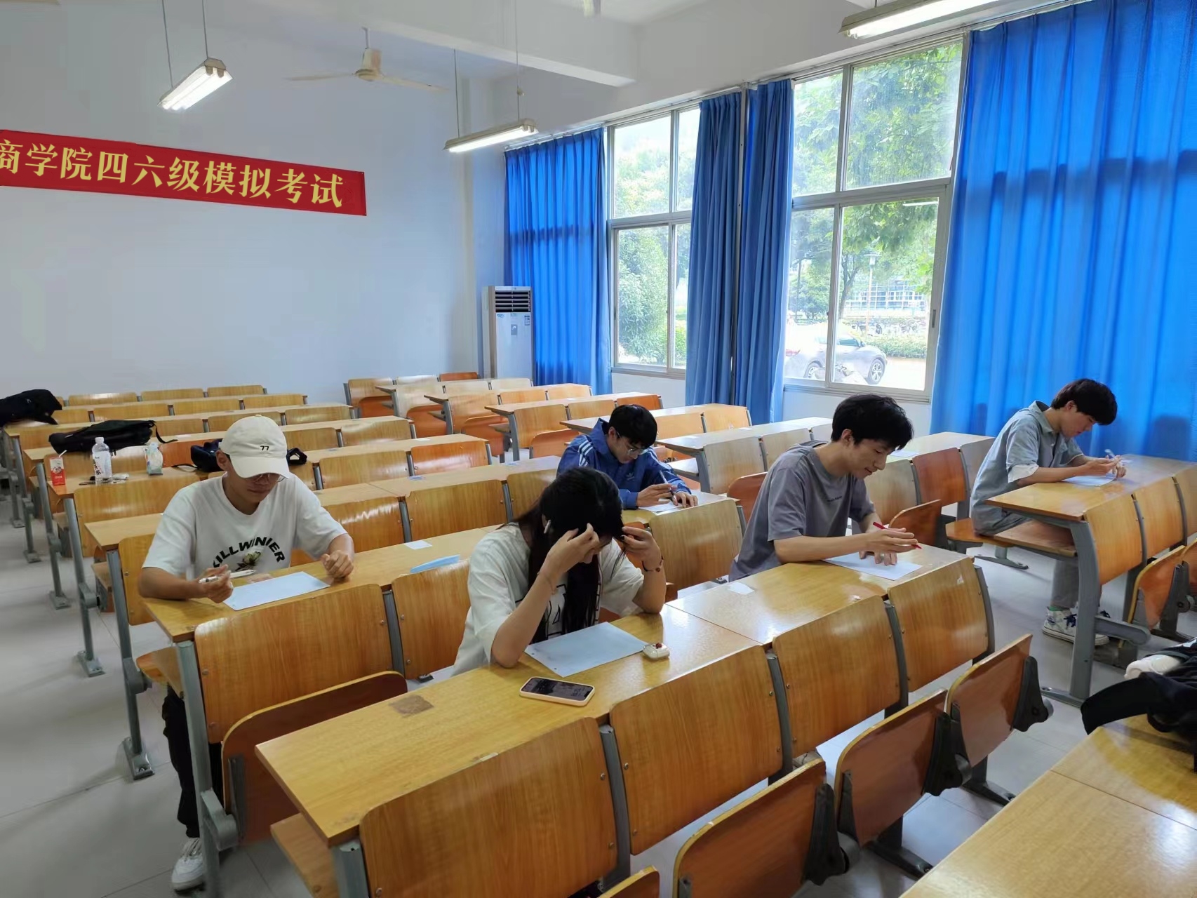 此次模拟考试以“严肃考风考纪,诚信应考”为原则,考试流程严格按照全国大学英语四六级考试进行,旨在帮助同学熟悉考试流程,缓解实战压力。开考前,监考人员按照程序下发试卷并宣读考试规则及注意事项,同时严肃申明考场纪律;随着铃声响起,考试正式开始,同学们奋笔疾书,认真作答,自觉遵守考场纪律,展现出公司学子的风范和态度。考试过程中,参加模拟考试的同学们沉着应对,凭借考前积累稳扎稳打,以严谨的态度对待本次考试。考试结束后,考生们信心满满的交上答卷,有序离开考场。