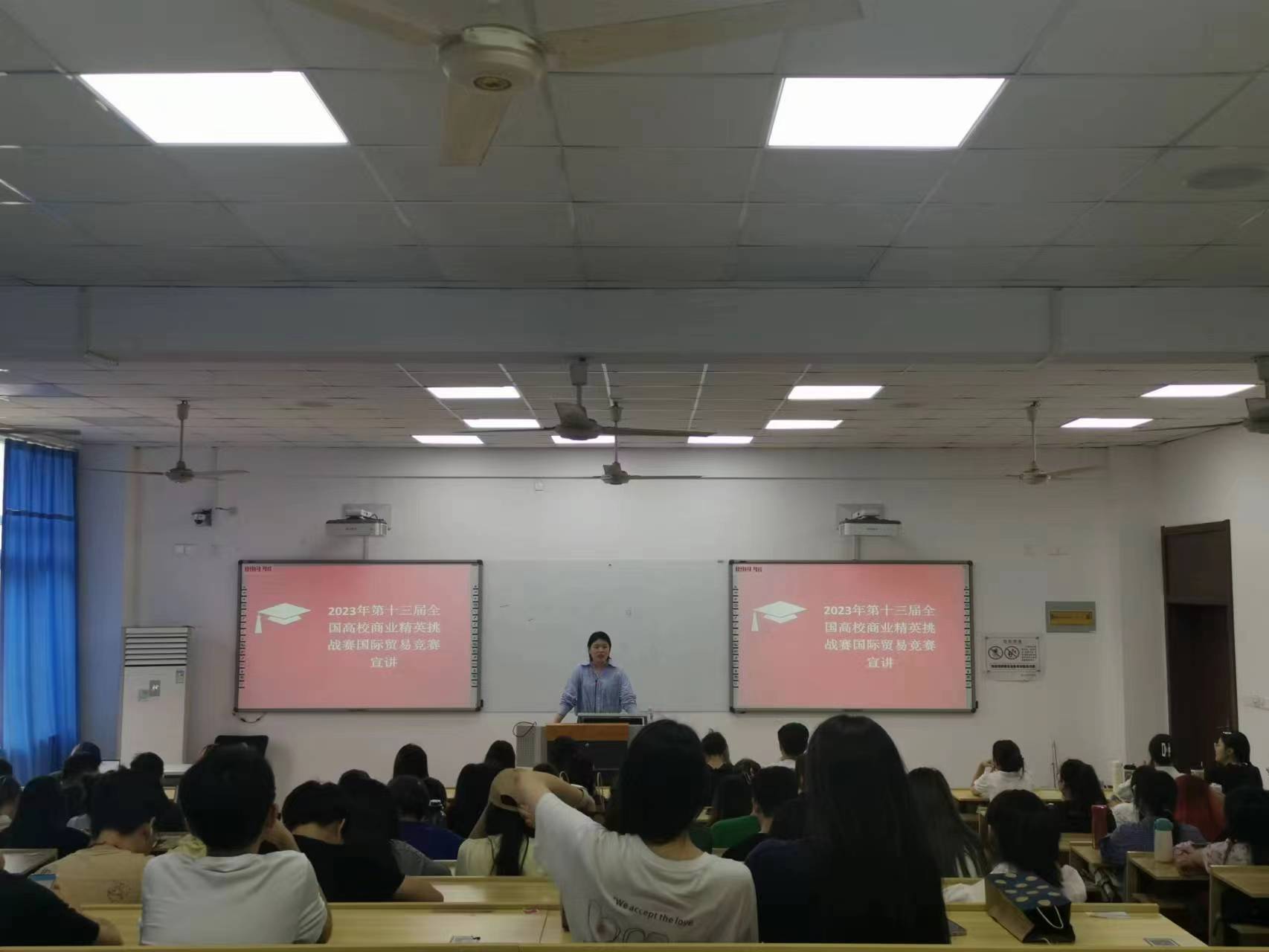 2023年6月7日,马媛老师在3-301教室给130多名国贸系员工介绍了第十三届全国高校商业精英挑战赛国际贸易竞赛比赛的规则和比赛的内容。