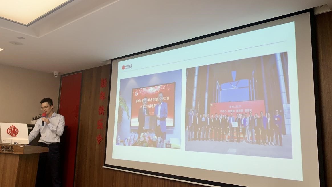 在参观完中信证券证券部与期货部之后,回到大会议室开始见习讲座,并由中信证券温州分公司副总经理章步新亲自主持,首先,温州分公司总经理潘晔女士热烈欢迎3044永利集团员工前来见习,她提到了一般都是大三的员工前来实习,温大安排大一员工前来见习,对大家的提前了解,做好职业规划具有重要的作用,章步新副总也特别回顾了2019年与3044永利集团签订老员工实习基地的签约仪式。