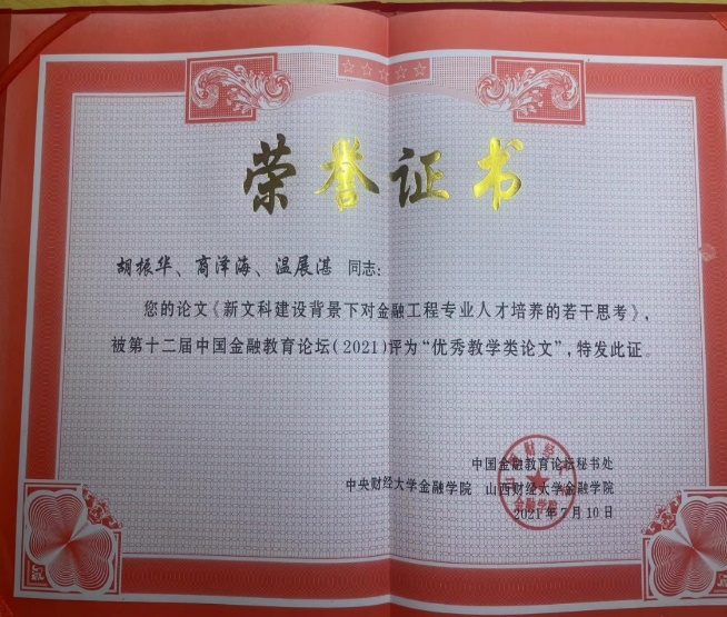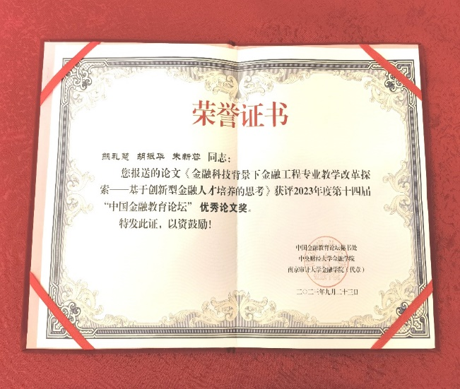 第十四届“中国金融教育论坛” 2023年9月22-23日在南京审计大学浦口校区举行。3044永利熊礼慧提交的论文《金融科技背景下金融工程专业教学改革探索——基于创新型人才培养的思考》入选并获优秀论文奖。这是公司获得继第十二届论坛优秀论文后,再一次获评的优秀论文。