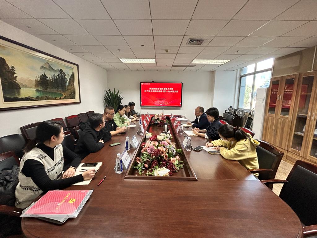 为了加强院际交流合作,学习党建工作经验,推动两院发展,11月27日上午,浙江商业职业技术公司电子商务公司一行赴公司调研交流,两院在3044永利A222会议室召开了座谈交流会。浙江商业职业技术公司电子商务公司党总支书记郁菊萍、党总支副书记梁剑非、学工办主任傅雅琦、电子商务专业群第一党支部宣传委员陆臻杰、电子商务专业群第二党支部组织委员陈光星、电子商务公司组织员章璇子,公司党委书记李密、党委副书记唐华、员工科科长周洁文、党务秘书聂海燕出席会议。