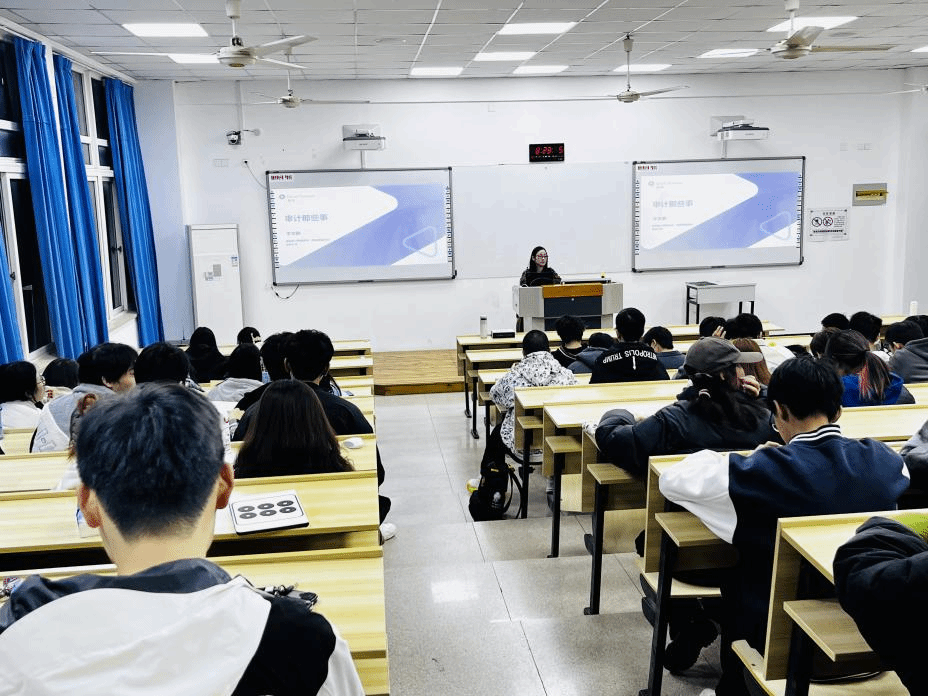 王光昌先生结合自身成长经历,强调韶华如驶,“百舸争流,奋楫者先”,冀望同学们以隙穴之窥的精神砥砺前行,用奋斗书写精彩人生。随后,王光昌先生详细地分析了当前的市场形势,着重点出了人工智能给会计行业的发展将带来巨大变革和影响,他指出,当代的员工应成为综合型会计才能避免被机器人所取代。紧接着,王光昌先生介绍了新时代财务管理体系和各业务系统财务业务一体化两方面,他希望同学们能够有意识地将所学的知识融合运用于实践中。王光昌先生提出,要掌握好底层逻辑,思维要与时俱进,提高分析问题能力和理解能力,将大学学习的知识转化为能力,增强自己的竞争力。