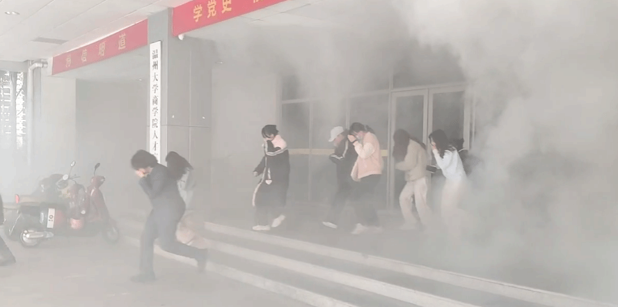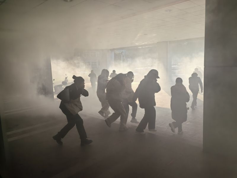 随着演练警报声的响起,楼道内预设起火点浓烟滚滚,在保卫处老师的指引下,员工捂住口鼻,降低身姿,沿着预定的疏散路线,快速有序地撤离至安全地带,站队、清点人数、汇报情况。整个疏散过程配合默契,疏散路线清晰,组织有条不紊,人人各尽其责,达到了“迅速、安全、有序”的演练目标。