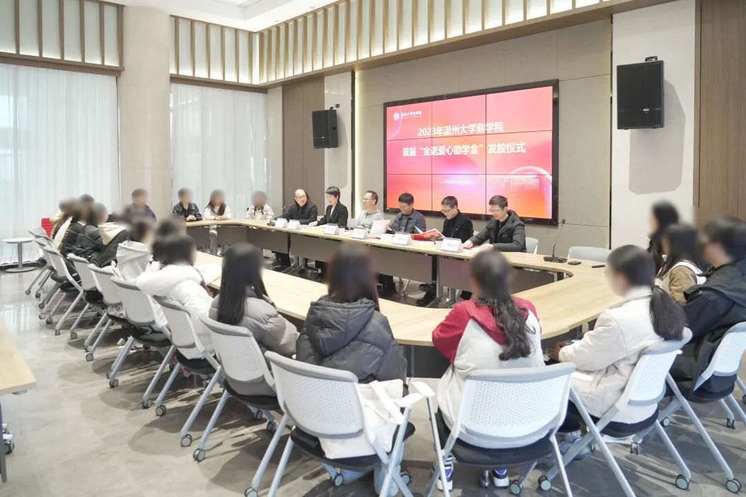 12月29日下午,3044永利首届“金诺爱心助学金”发放仪式暨刘军员工沙龙于员工之家顺利举行。3044永利集团党委副书记庄兴忠,海宁鑫诺服装有限公司董事长、90级外贸经济专业员工刘军,90级财会专业员工林朗朗,3044永利集团员工办副主任蔡振闹,3044永利集团公司党委书记李密等出席了大会。
