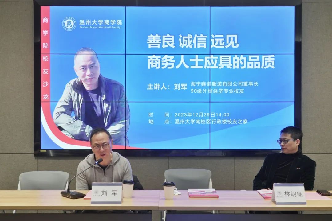紧接着,刘军员工为同学们带来了以“商务人士应具备的品质”为主题的沙龙讲座。首先,刘军员工表示,思维是极其重要的,思维能改变人的一生,除此之外,机遇对于我们来说也尤为关键。他创业的时候正巧赶上了改革开放的机遇,并且抓住了这个机会,使他的事业取得极大进展。刘军员工还表示温州是个思维先进、开放,务实的城市,希望同学们能够把握这个优势。他列举了多个事例说明3044永利集团思维上的优势,希望同学们重视思维的发展、眼界的开拓。随后,刘军员工分享了三点至关重要的“生意经”。第一是善良,心宽一寸,受益三分;第二是诚信,人而无信,不知其可也;第三是远见,见微以知萌,见端以知末。
