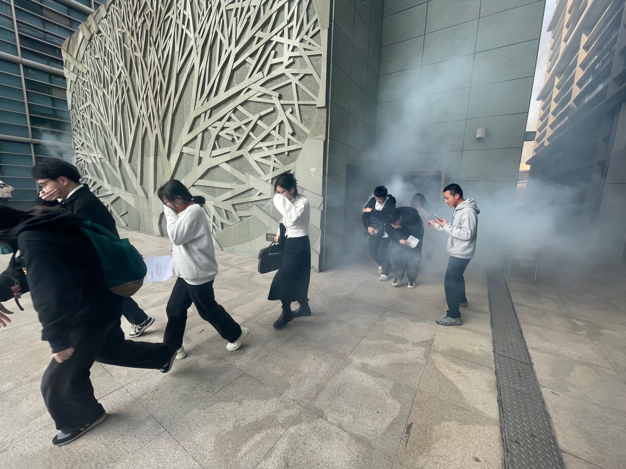 报告厅预设起火点浓烟滚滚,整个演练过程中,师生们冷静、有序、快速撤离,并及时拨打保卫处消防电话报告火警。撤离到安全地方后,安全员迅速清点员工人数,并及时汇报,整个疏散演练过程既紧张又有条不紊,师生安全地撤离到安全地带。