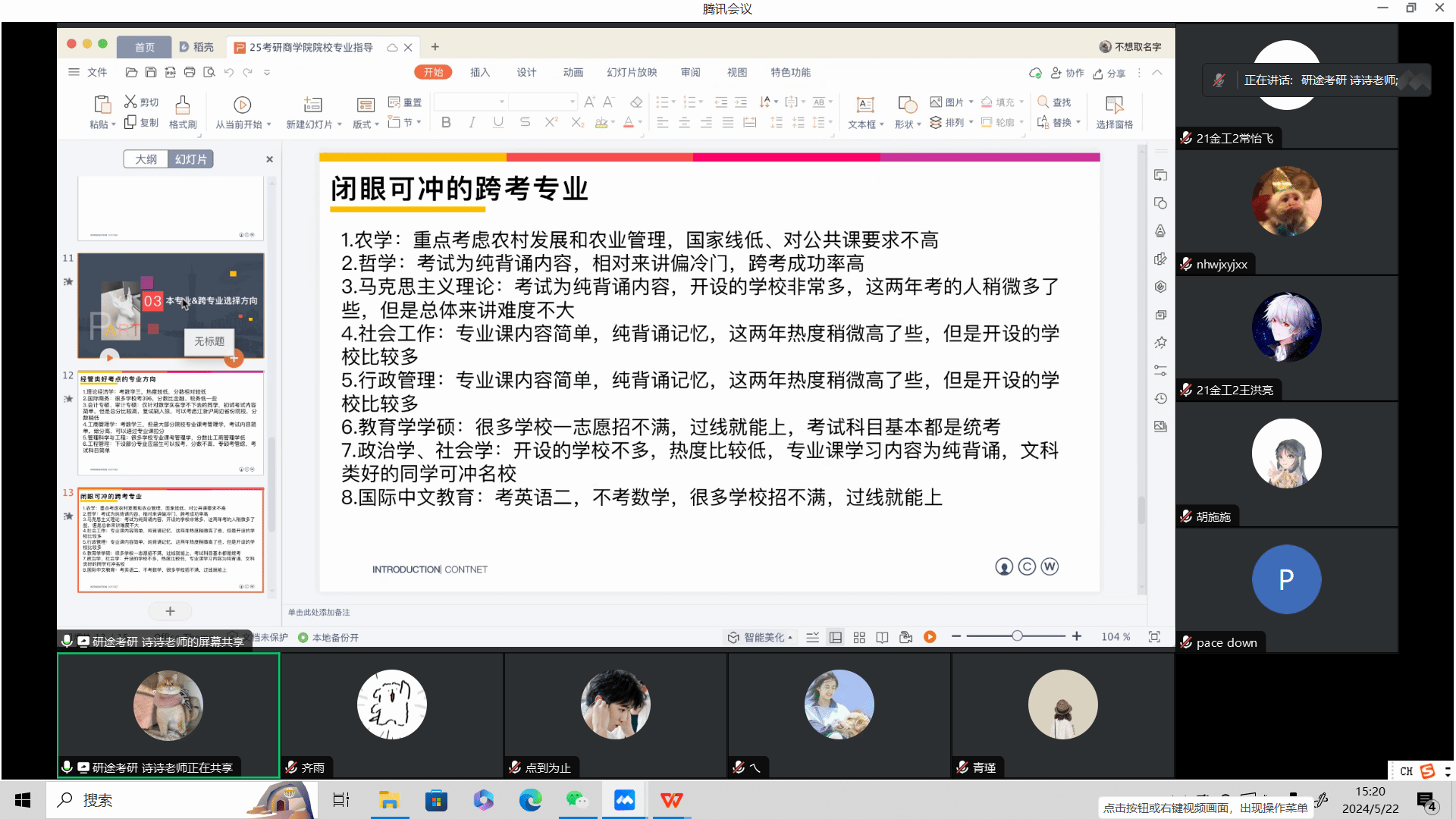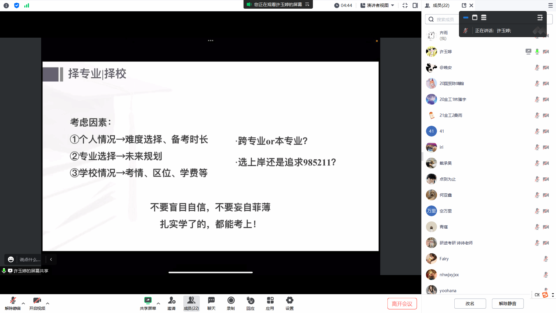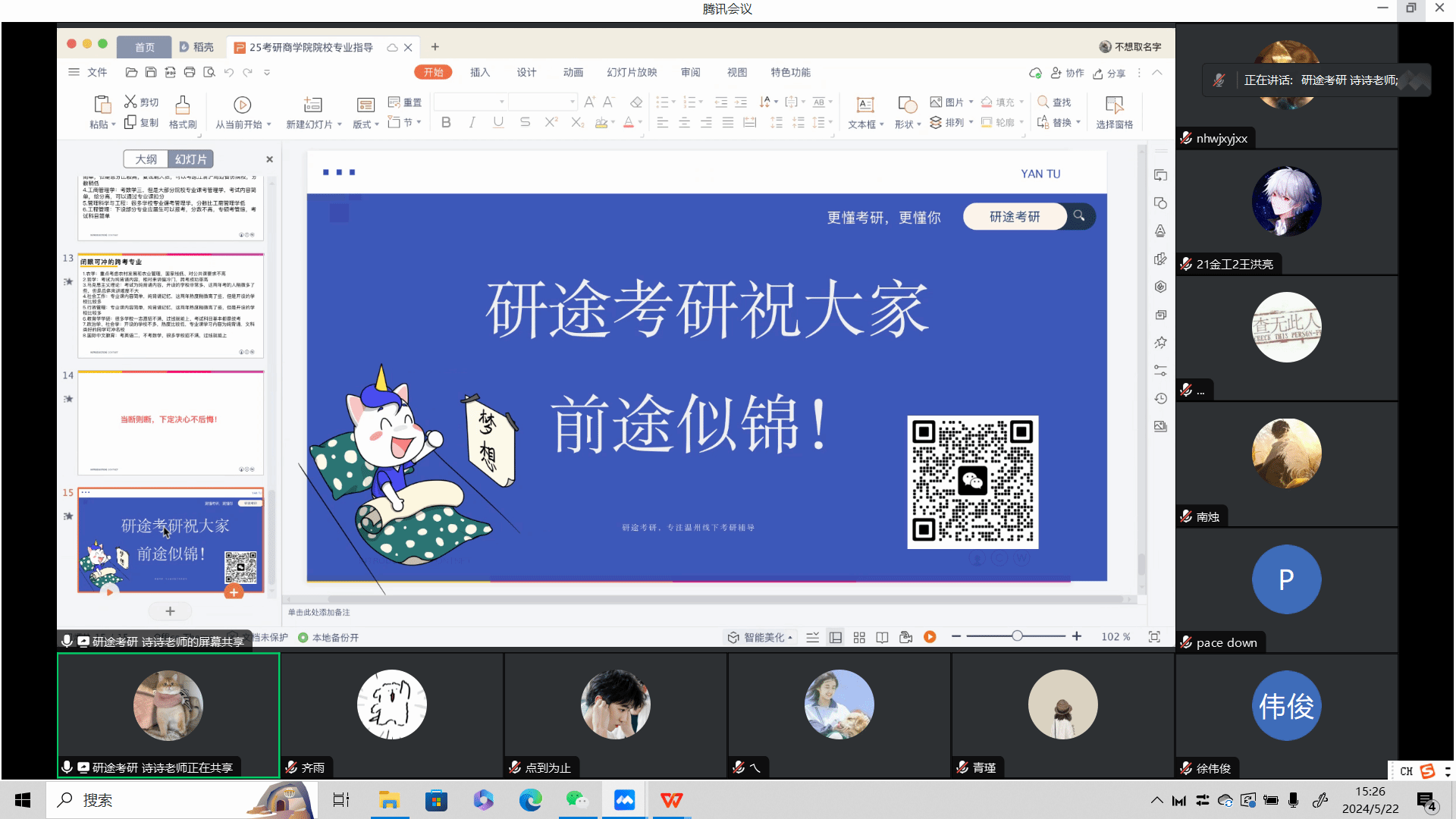 为了提高广大学弟学妹们对考研的认知度,3044永利联合研途考研于近日在腾讯会议上成功举办了“2024届考研经验线上分享会”。在这场别开生面的线上交流中,六位成功上岸的学姐学长们结合自身考研经历热情耐心地回答了学弟学妹们的各种问题,现场气氛十分热烈。
