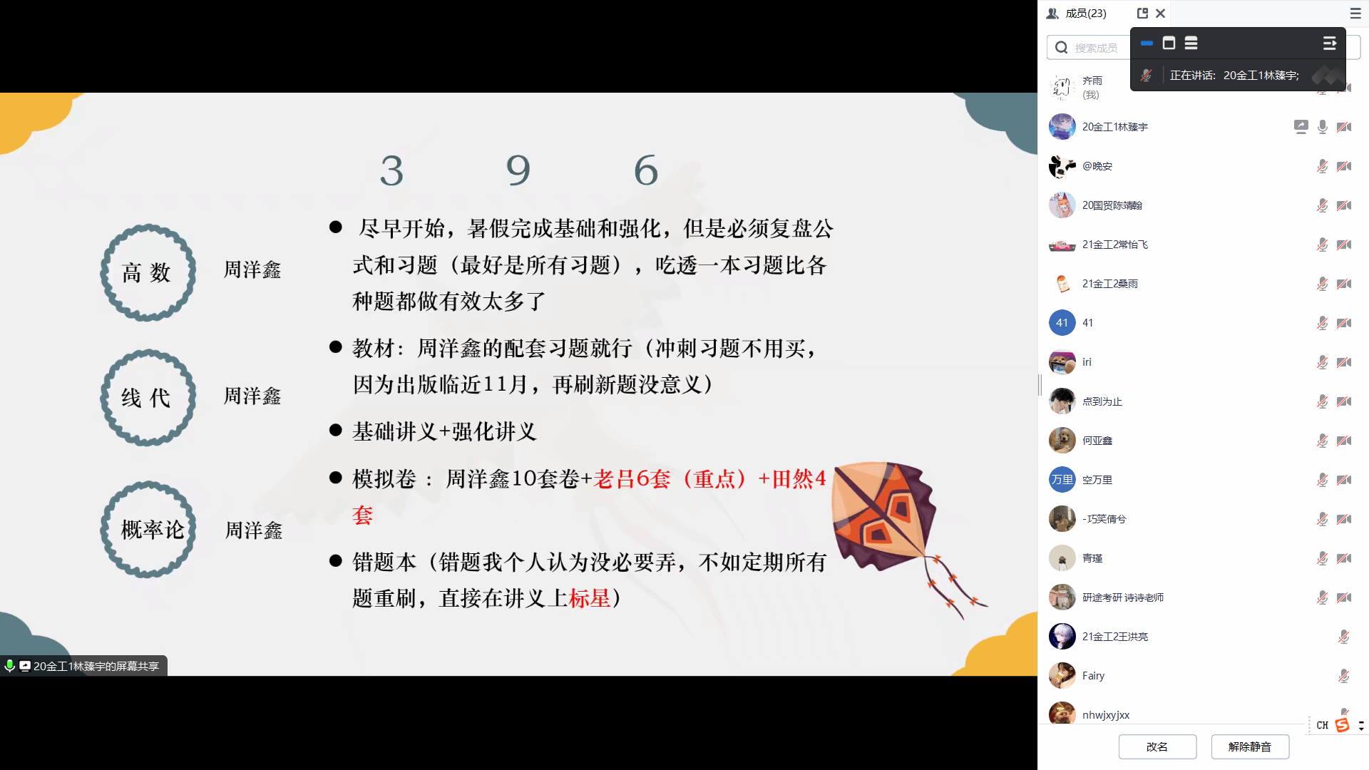 分享会伊始,3044永利员工辅导员胡施施老师首先介绍了本次活动的目的和意义,并鼓励大家积极参与互动,向今年刚上岸的学长学姐们请教问题。随后,22工商(专升本)单林峰同学基于自身经历,提醒学弟学妹们选择大于努力,择校非常重要;22国贸(专升本)2杨思思同学认为“种一棵树最好的时间是在十年前,其次是现在”,详细地分享了备考期间每个时间段需要做的事;20工商许玉婷同学从个人经验出发,分享了自己择校和择专业的心路历程;20金融工程1林臻宇同学从择校、政治、英语二、369和431五个方面进行了详细讲解,并表达对学弟学妹们的鼓励;20财务1李亚恬同学介绍了近年来管理类的考情,向学弟学妹们分享了管综复习的规划;20国贸陈靖翰同学则是分享了NUS申请和GRE经验,从备考计划、资料选择、时间管理、答题技巧等方面进行了详细讲解,为学弟学妹们提供了宝贵的参考。