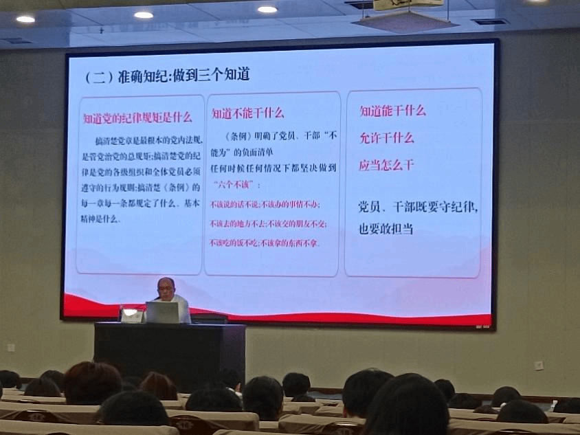 最后,唐华书记强调了《条例》贯彻执行的落脚点。他提出,广大学子要认真学习《条例》,做到“三个知道”——知道党的纪律规矩是什么,知道能干什么、允许干什么、应当怎么干。在严格守纪方面,要做到“四不两要”——不搞变通、不打折扣、不留余地、不玩花样。这些要求为我们指明了贯彻执行《条例》的具体路径和方法。