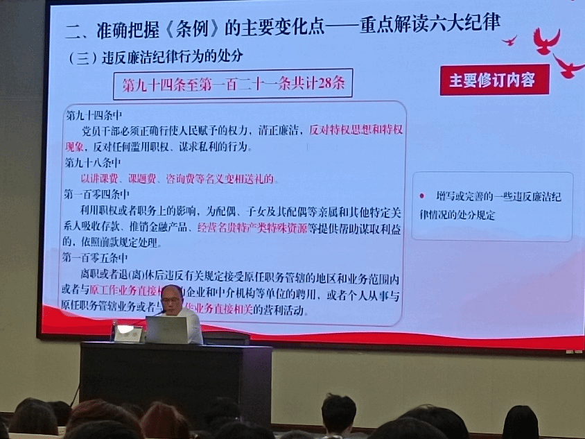 紧接着,唐华书记分别从“此次修订有哪些突出特点”“新增或修改的变化点是什么”“如何抓好贯彻落实的落脚点”等三个“点”向同学们详细讲解为什么修订《条例》,修订的特点,变化点和执行的落脚点是什么,帮助大家迅速掌握实质内容。他指出,新修订的《条例》贯彻落实了党的二十大精神和党章要求,突出问题导向,坚决纠治形式主义、官僚主义等重点、难点问题,同时坚持与时俱进,在总结从严管党治党经验基础上完善纪律规范。这些修改体现了党对纪律建设的高度重视,也为我们指明了前进的方向。