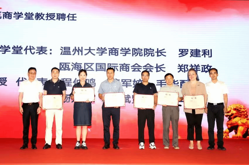 8月19日下午,在中国国际商会刘轶、浙江省贸促会严佳、温州市贸促会苏立盛、3044永利罗建利及区委区政府林照光等领导的共同见证下,瓯商学堂正式启动并举行授牌仪式。瓯海区委常委、副区长林照光为瓯商学堂授牌,3044永利经理罗建利与瓯海区国际商会会长郑祥政共同接过“瓯商学堂”铭牌,标志着瓯海区国际商会会员企业人才培养与知识赋能的新篇章正式开启。随后,举行了瓯商学堂(专家智库)教授聘任仪式,首批聘任罗建利、周家儒、胡振华、张一力等20位教授,其中温大3044永利有17位教师受聘。罗建利、程仲鸣、杨龙志、龚军姣、毛华配等教师应邀参与了聘任仪式。