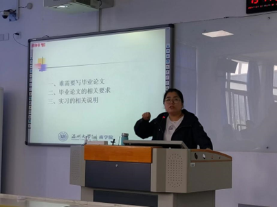 大会上,方嘉奇老师首先强调了毕业论文的重要性,提醒同学们所需关注的时间节点和完成质量要求,详细说明了系统所需进行的必要操作,并且督促全体员工要主动积极地联系指导老师。此外,方老师还说明了下学期的实习要求,强调了实习期间的安全问题,需要妥善处理实习与论文两者之间的时间分配,遇到问题要及时同指导老师沟通,并按时上传指导记录。