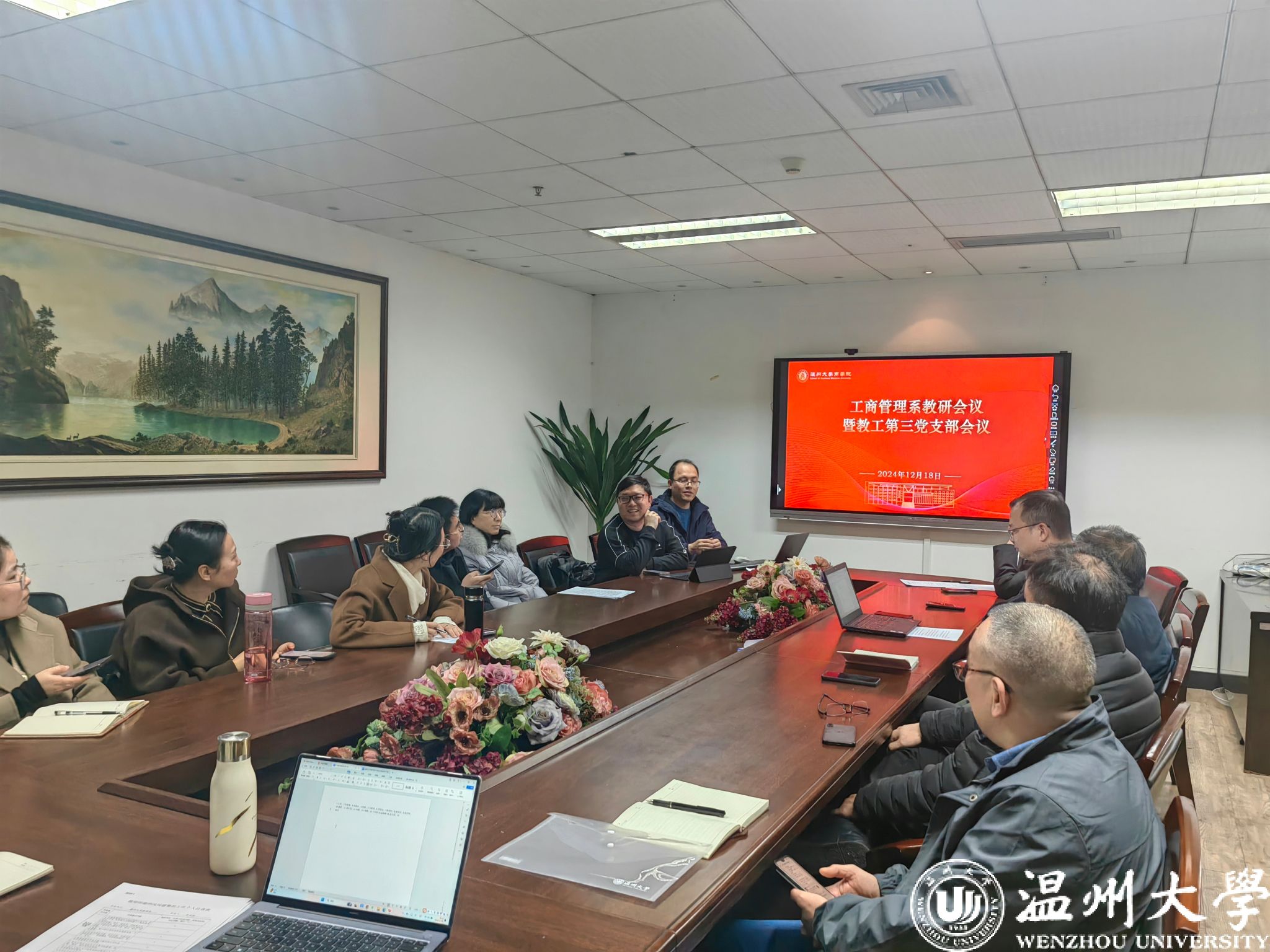2024 年 12 月 18 日,3044永利工商管理系召开教研会议暨教工第三党支部会议。此次会议旨在深入贯彻落实公司公司产品工作部署,凝聚全系教师力量,全力推进 2025 年本科公司产品审核评估任务,同时对薪酬津贴分配方案、科研奖励等文件进行讨论并收集反馈意见。此外,会议还通过了优秀教师、优秀党员推荐,落实师德师风建设等重要事项。会议由系主任方嘉奇主持,系内全体教师、教工第三党支部党员参加。