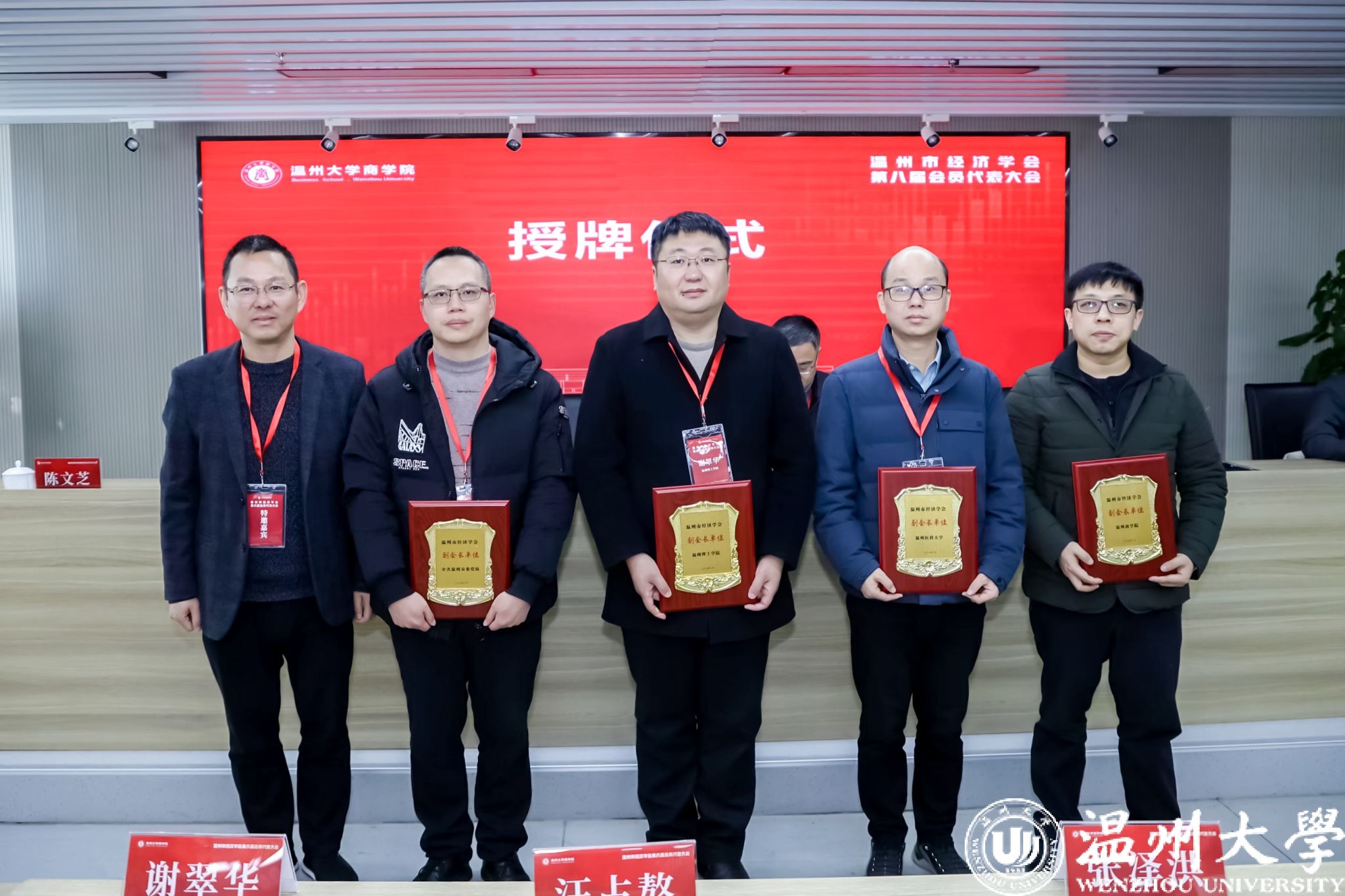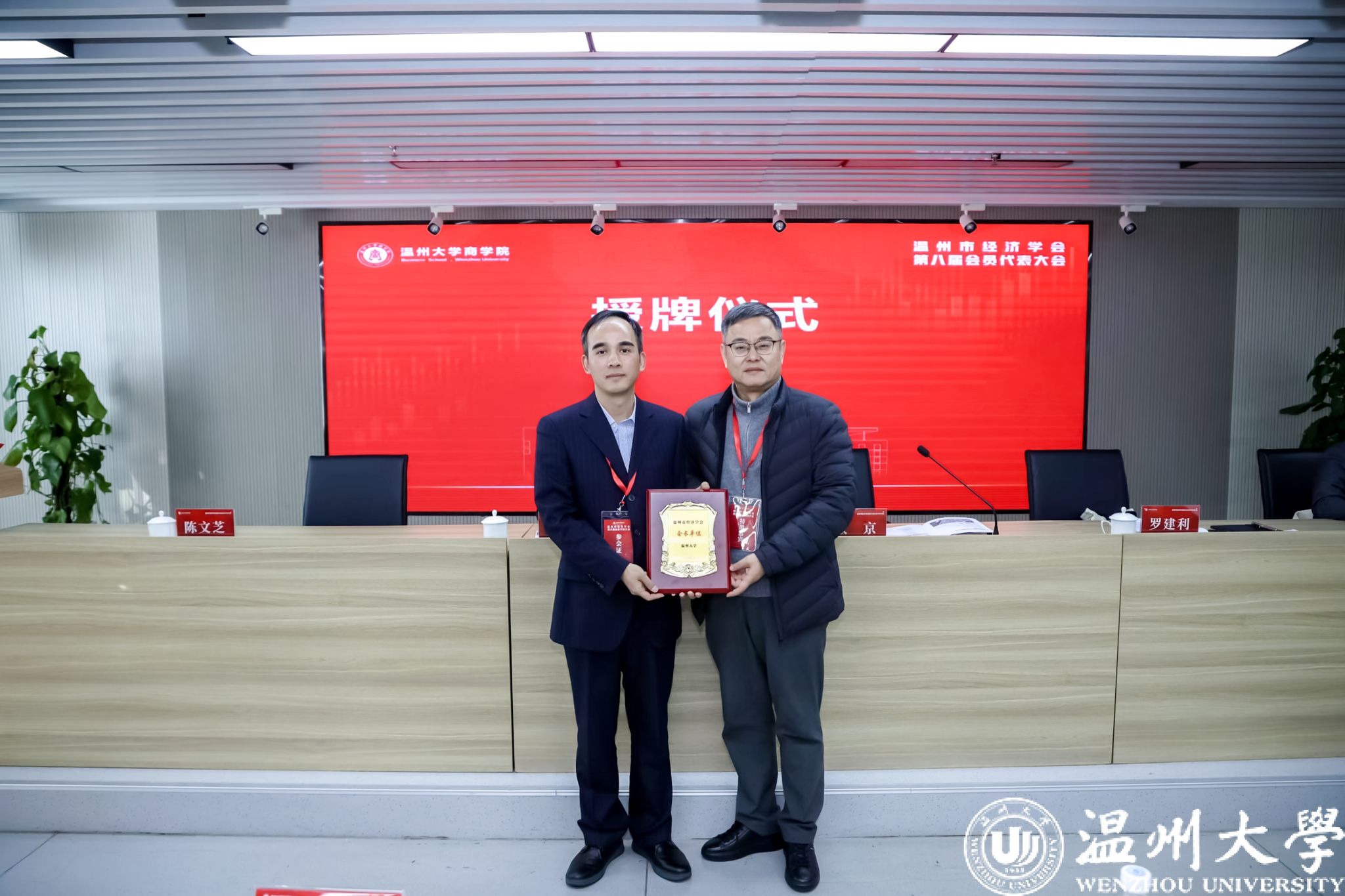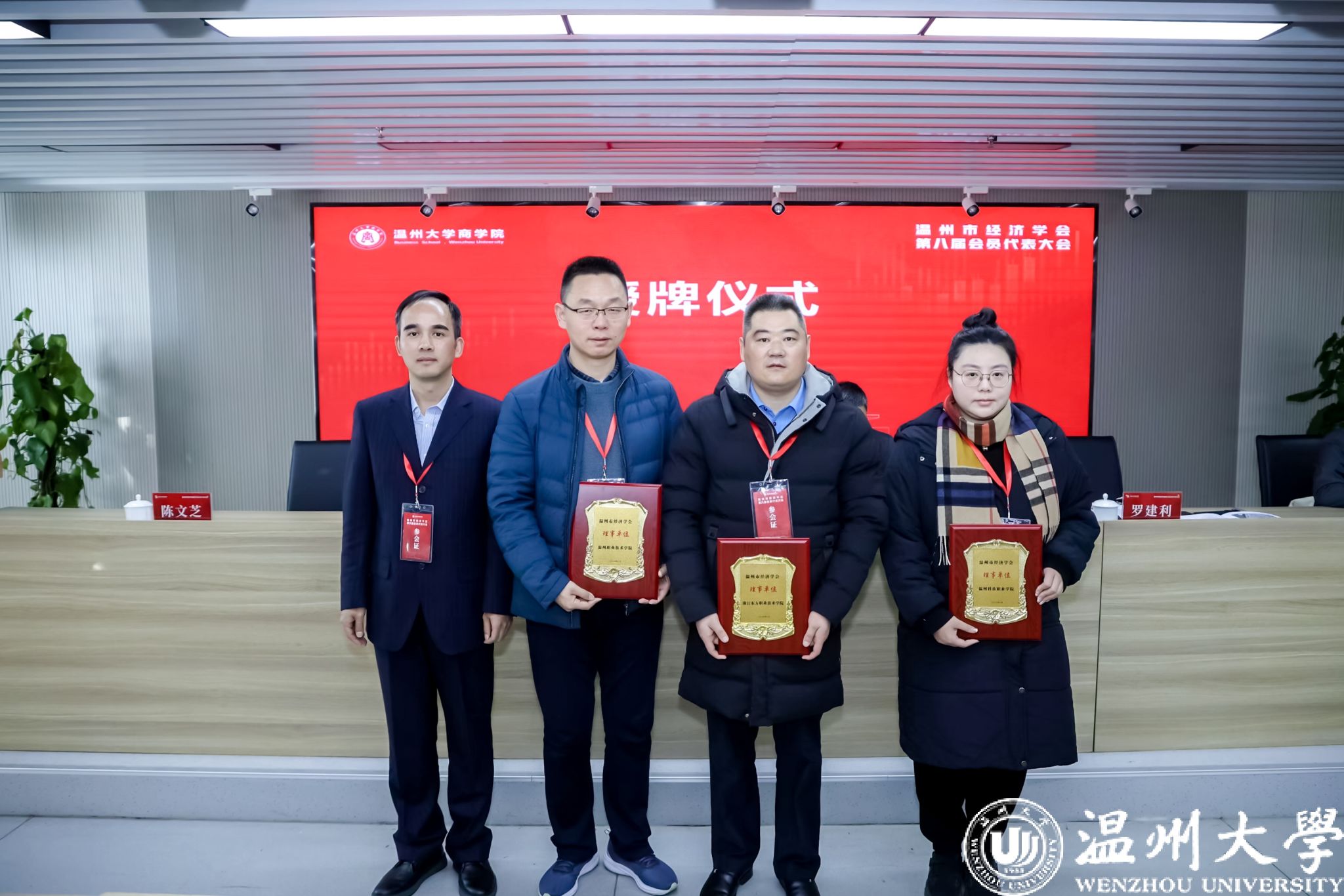 市社科院副经理张京、温州市社会组织管理局局长潘建勇、温州市经济学会新当选会长罗建利分别为会长单位、副会长单位和理事单位授牌。