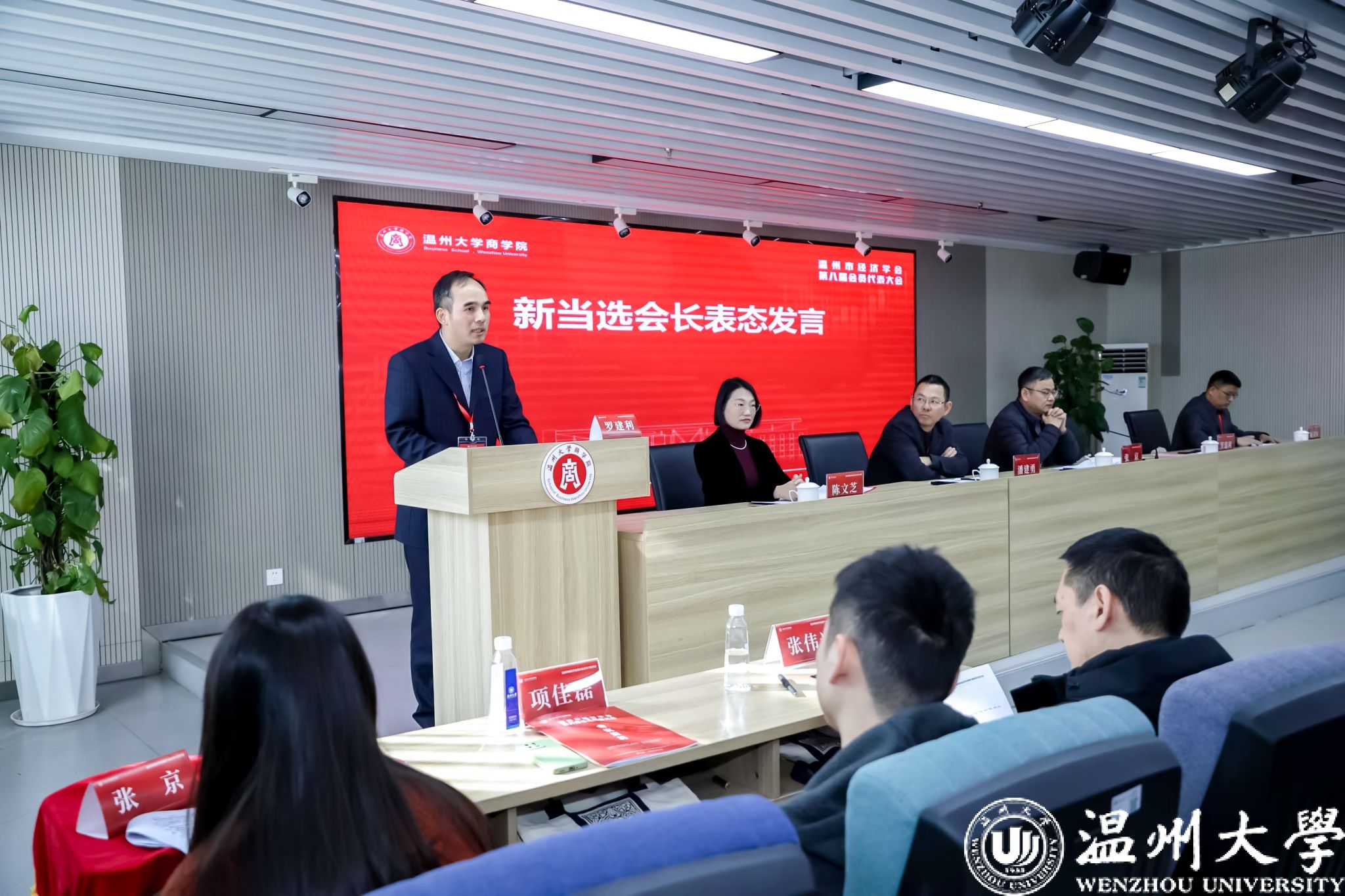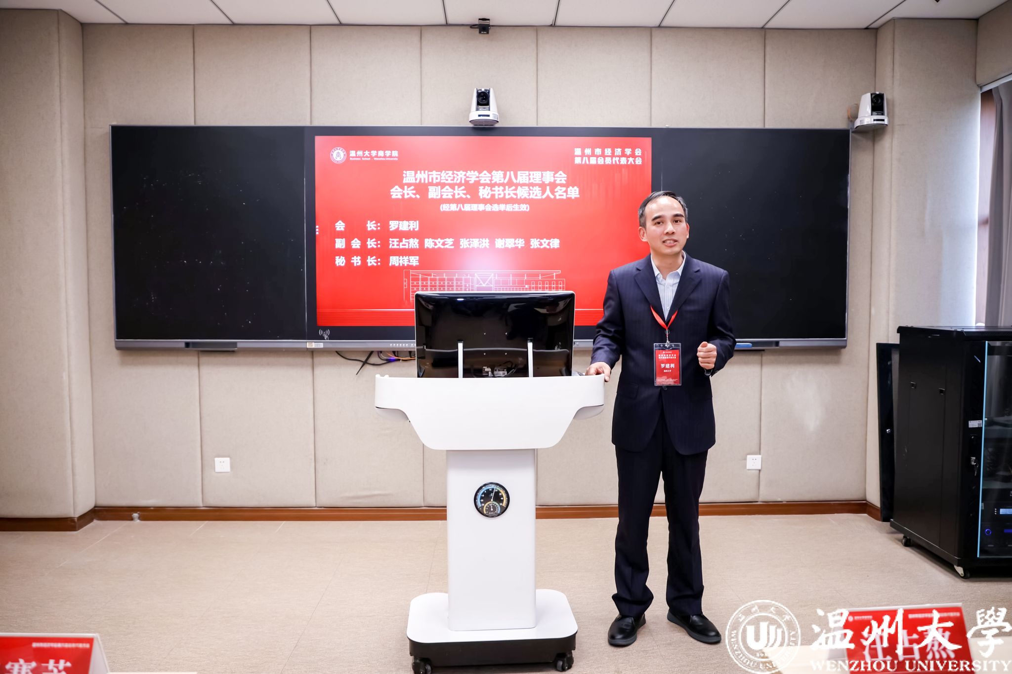 罗建利会长代表新当选的领导班子成员,在授牌仪式上发言,指明了温州市经济学会未来的发展方向,并表达推动温州经济学会发展的决心。