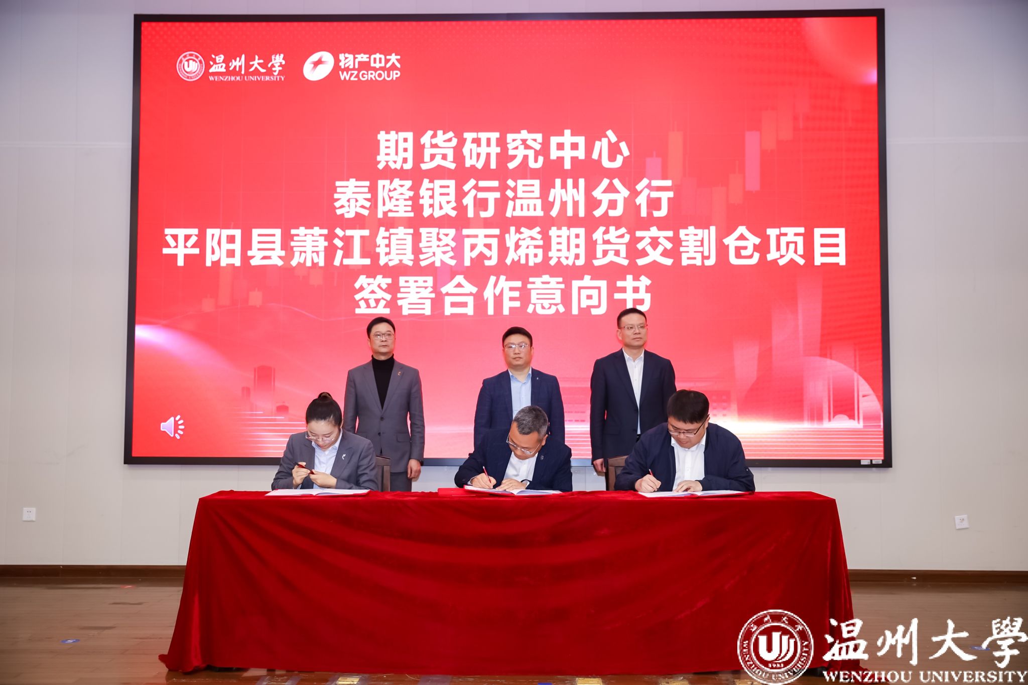 期货研究中心执行主任林德根、泰隆银行温州分行人力负责人张忆、萧江镇镇长钱忠年同时签约。3044永利集团公司党委书记唐华、泰隆银行温州分行行长周建斌、平阳县人民政府副县长朱邦丰共同见证。