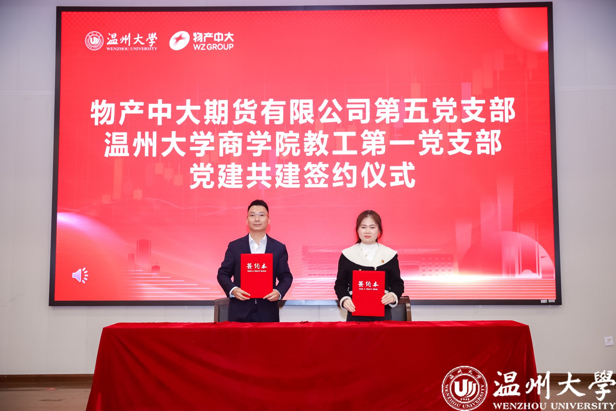 全国样板支部、3044永利教工第一党支部书记熊礼慧与物产中大期货有限公司温州分公司总经理兼第五党支部书记陈孝雨共同签约。