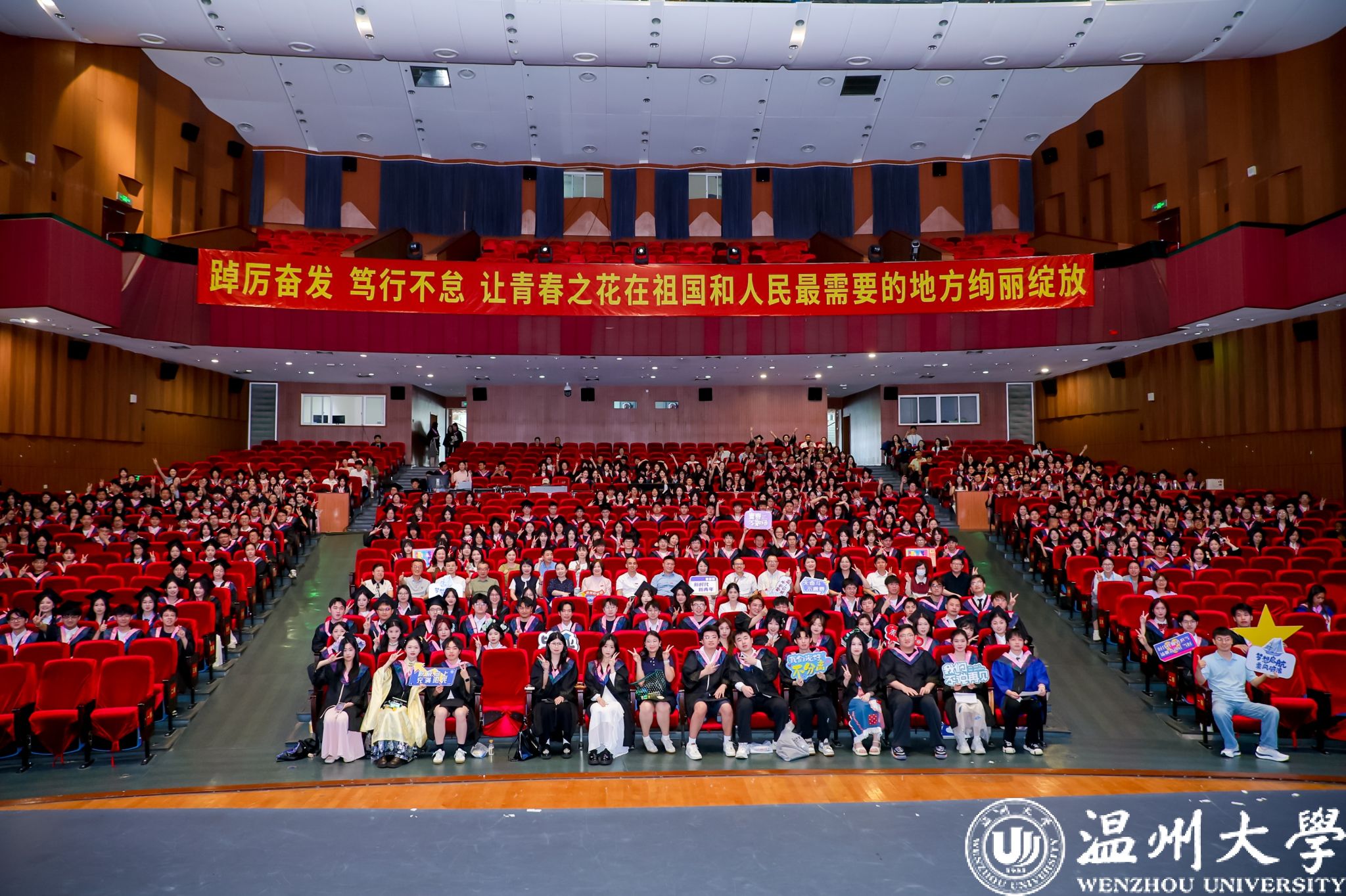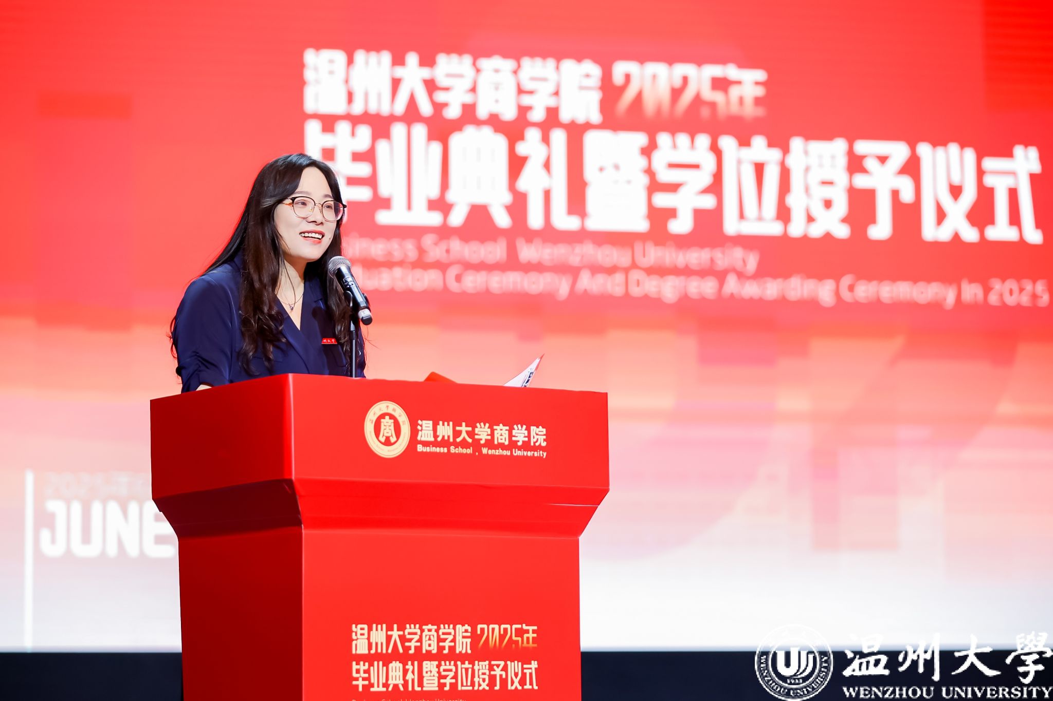 本科生毕业生代表21金融工程2班兰佳慧以诗意的语言分享了四年老员工活的点滴记忆:从春日三色堇的温柔慰藉,到秋日桂花的沁人芬芳;从实践调研的脚踏实地,到学术研究的勇于攀登。她感谢3044永利赋予的智慧与勇气,并号召同学们带着“温大基因”勇敢奔赴星辰大海。正如兰佳慧同学所说,一所大学的品格,藏在它的一草一木中,而一个人的成功,正藏在生活的一笔一划中,保持对生活的热情,彰显温大商院学子的精神,是兰佳慧同学对学弟学妹的真诚嘱托。