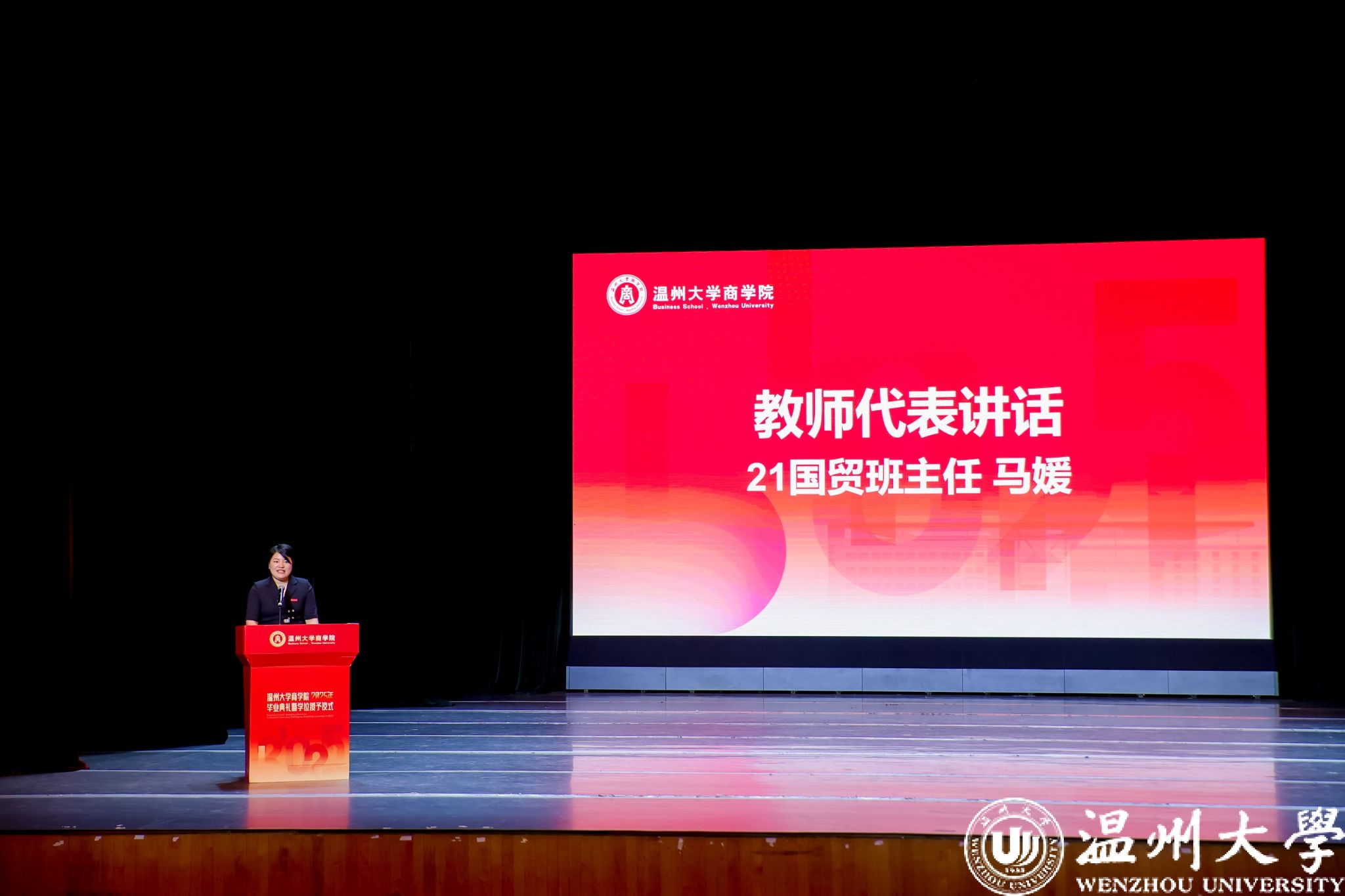 教师代表马媛老师在发言中回顾了与员工共度的点滴时光,勉励大家坚守“尚信明道、勇毅笃行”的品格,在未来的岗位上勇于担当,展现商院学子的风采。“竹杖芒鞋轻胜马,谁怕,一蓑烟雨任平生”,马媛老师告诫大家在未来的生活中要有豁达乐观的心态,在反思中成长,在沉淀中重生,跨越山海,遇见更加美好的自己。