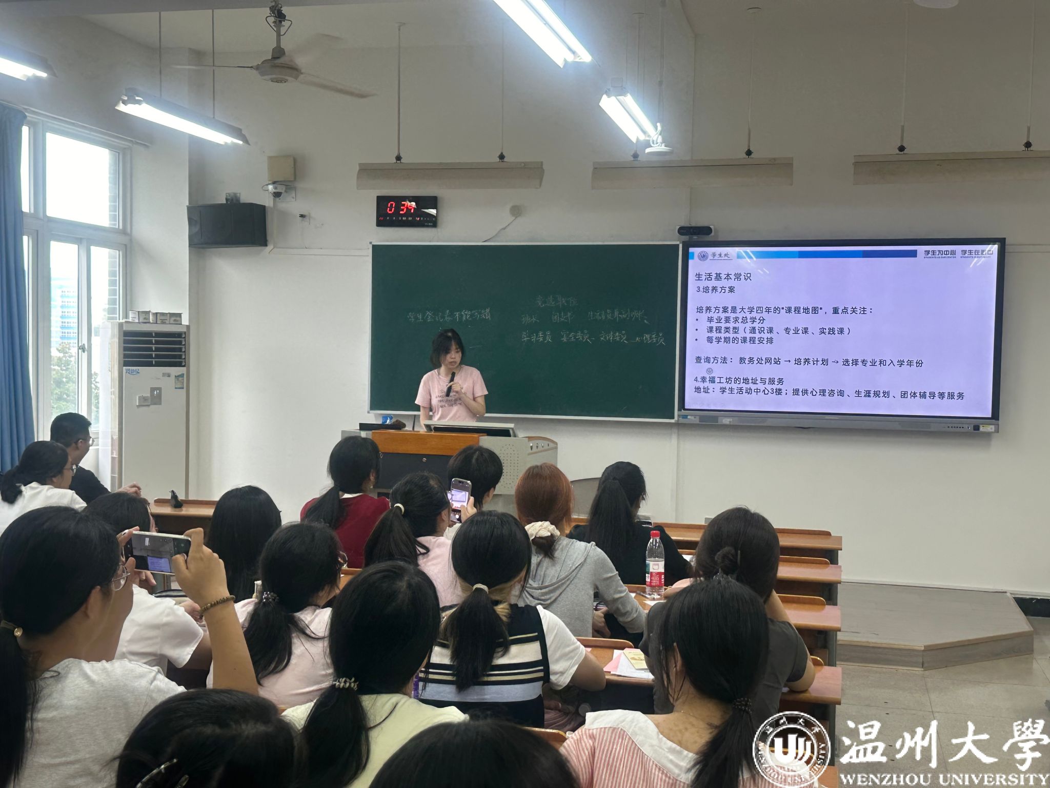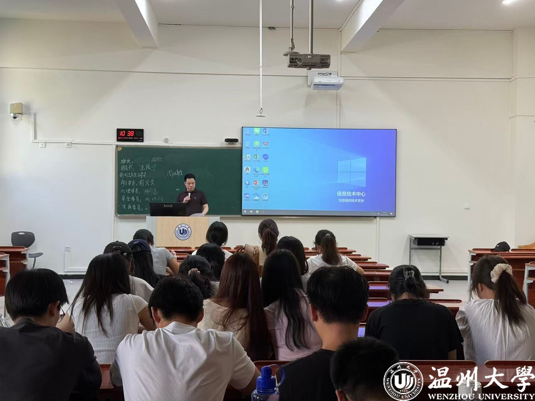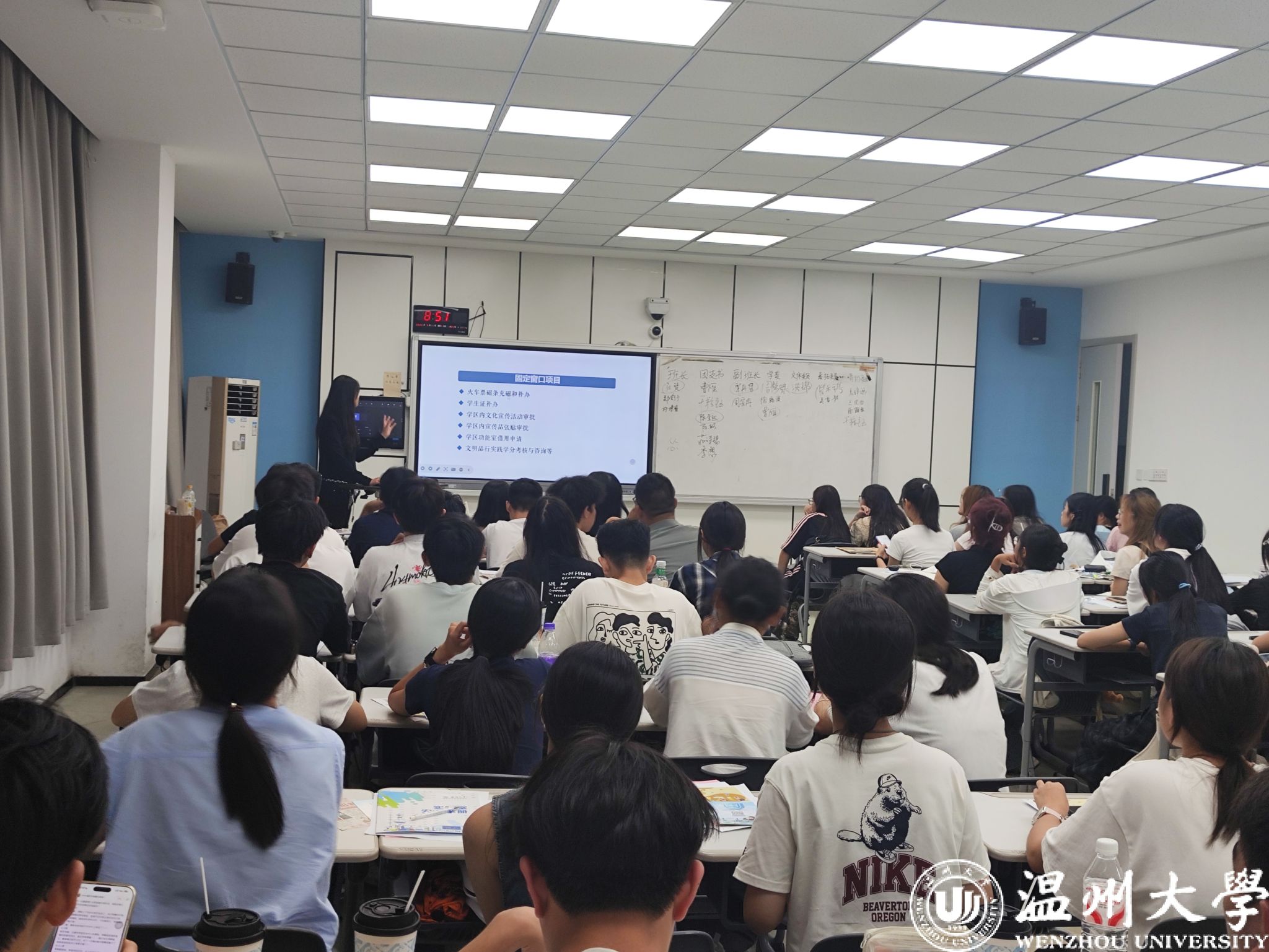 接着,进入事项解读环节。班主任们聚焦马克思主义宗教观,结合法规与校园实际,明确“宗教与教育相分离”原则;通过“校园贷”“刷单诈骗”等案例,讲解诈骗防范要点,提醒新生守护财产安全。班助解读《员工手册》中纪律处分条例、违规大功率电器使用规定;介绍必须关注的校园公众号、宿舍报修途径、校园通知查询方法、培养方案查询路径、幸福工坊地址,以及校院员工会、员工社团情况。