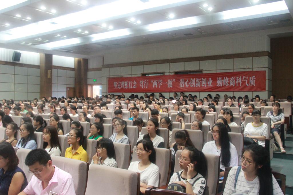 庄严肃穆的国歌声拉开2017级新生开学典礼的帷幕。郑彩莲书记在致辞中代表公司向17级新生的到来表示衷心的祝贺和诚挚的欢迎。郑书记围绕“概率与你”的主题,向新生提出“提高大学期间成才的概率、提高大学期间善于交往的概率、提高大学期间强身健体的概率、提高大学期间自我保护的概率”四方面的期望。她以17届优秀毕业生13金融工程班的朱圆缘同学为例,鼓励新生多与牛人交往,她认为交往是一种能力,善于交往更是一种智慧,要在交往中提升自己的格局;郑书记还以公司优秀员工王仲辉先生为例,建议新生及时明确目标,并付诸行动坚定前行。
