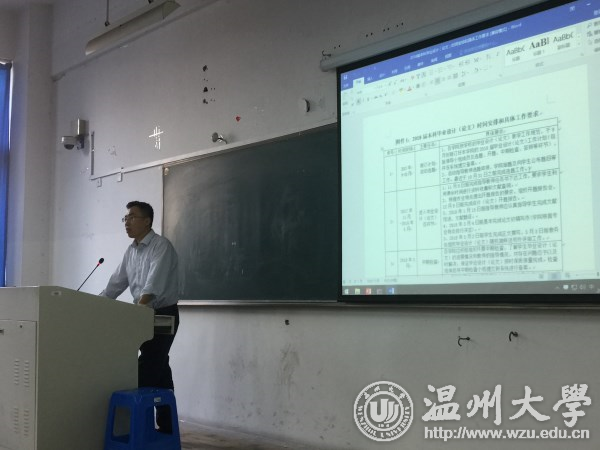 会议由王洪斌博士主持。他就毕业论文时间安排和具体要求做了详细讲解,包括各时间节点需要完成的任务,论文数据支称,导师选择,数据和参考文献查询等等。同时将毕业环节的实习要求和内容做了概述。内容涵盖实习企业的联系,实习时间要求,实习日志,调查报告,实习成绩鉴定等等。