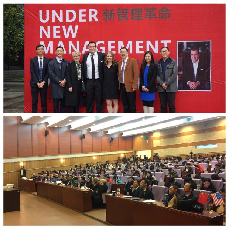 David Burkus教授首先给大家阐述了知识经济在重塑组织管理当中的重要性作用,并且依次提到了将员工放到第一位的各种方法和意义,随后深入浅出地介绍了有偿离职和薪资透明化的概念以及例子。演说全程由温大3044永利英国海归博士徐正老师交替传译,师生同学们对于两位“大咖”演绎的“新管理革命”报以连连掌声。