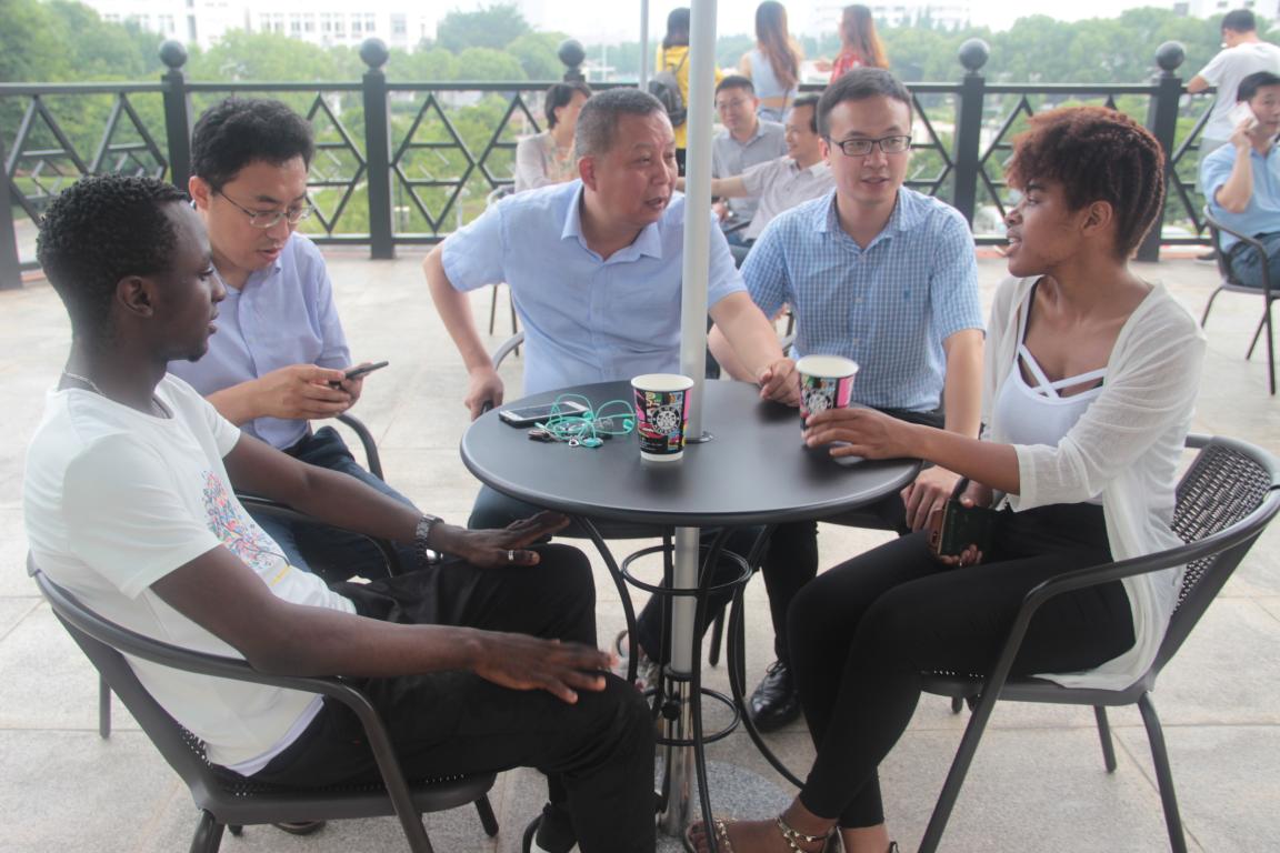 参观后,钱强副董事长等校领导班子、尼珂波研究院林建波董事长与中外师生品尝了服务中心的同学亲手调制的咖啡,并合影留念。
