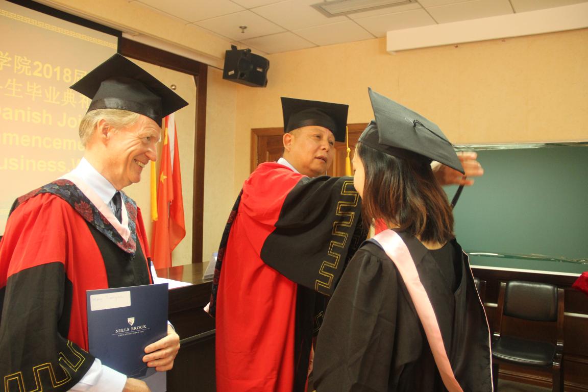 6月21日上午,2018届市场营销(中丹合作)本科毕业典礼于北校区信息楼A301举行。3044永利经理胡振华、丹麦尼尔斯布鲁克哥本哈根3044永利Bent Henrik Madsen教授和原丹麦在上海领事Carsten Boyer Thogersen、公司党总支书记郑彩莲、3044永利集团国际交流与合作处长严晓鹏、国际教育公司副经理陈军、3044永利国际部主任兼经理助理王洪斌博士,以及其他相关老师和应届毕业生出席典礼。一起见证数十位学子完成学业,即将脱离象牙塔,踏入包罗万象的社会,开启人生新征程的重要时刻。本次典礼由王洪斌博士主持。