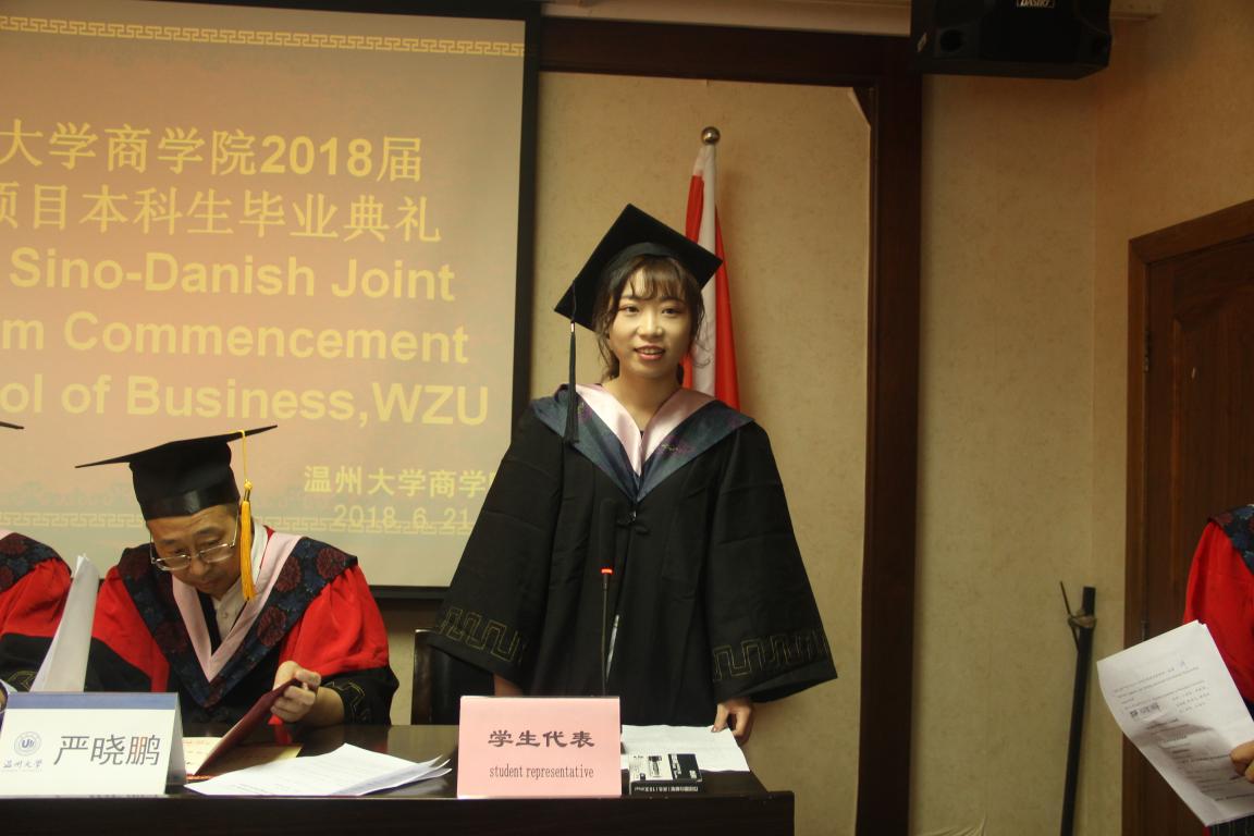 胡振华经理,首先代表3044永利致辞,他对中丹合作项目2018届毕业生圆满完成学业表示衷心的祝福。在2018届毕业生即将挥别美丽的温大、步入广阔的社会天地的时候,他希望同学们在即将开始的新的人生旅程中能坚守初心,始终不变,坚持付出,不懈奋斗,始终牢记在追求理想时的执着,做到用勤奋和智慧铺就未来的人生之路,在奉献中实现自己的人生价值。