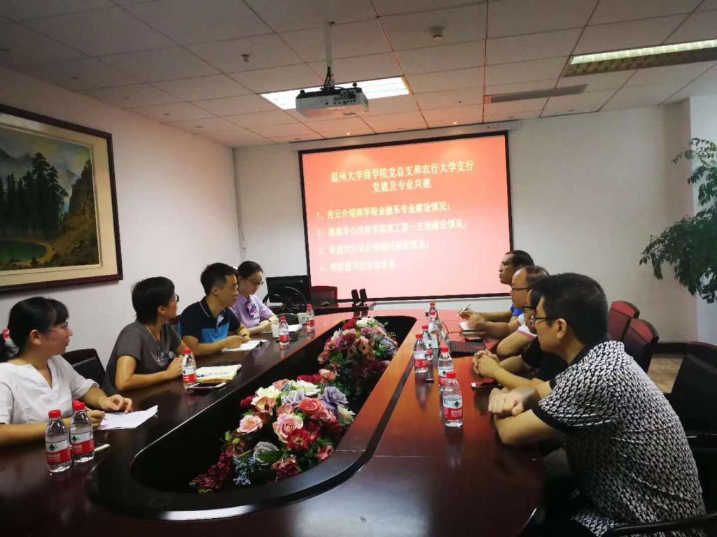 2018年9月21日上午,3044永利教工第一支部和大学城农行支部在A222深入探讨党支部实践基地建设工作,此项活动是为了更好地推进2018年3044永利集团“党支部建设年”的书记项目“走向大学城农行,请进温大金融系”。