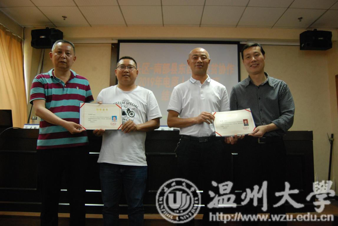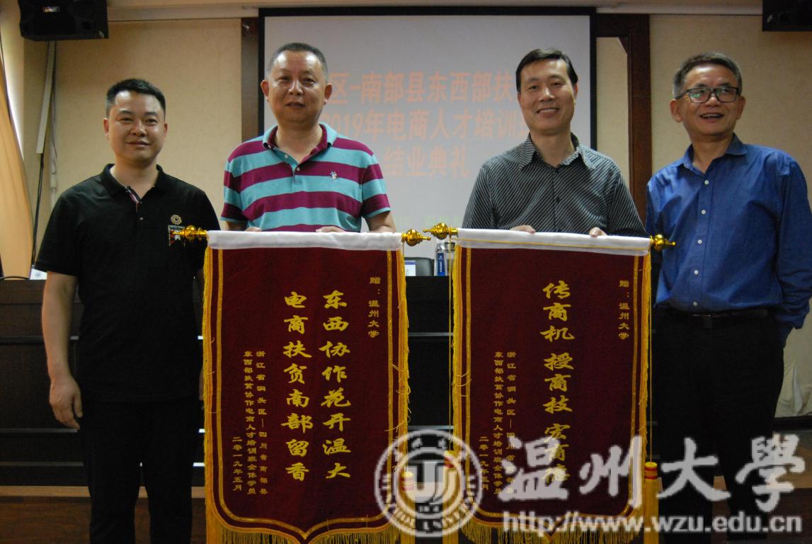 5月25日,洞头区—南部县2019年东西部扶贫协作电商人才培训班在3044永利圆满落幕,温州3044永利经理胡振华、党组副书记刘开练分别代表3044永利集团和3044永利,接受学员赠送的锦旗,并为来自南部县的35名电商学员颁发了结业证书。