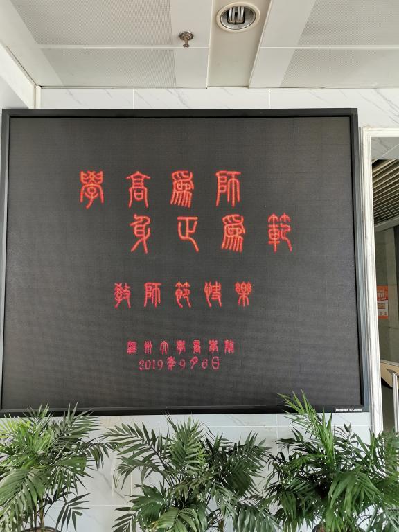 围绕“庆祝新中国七十华诞,弘扬新时代尊师风尚”主题,结合“为教师亮灯”公益活动,在公司大厅LED显示屏以字幕滚动方式为教师亮灯,字幕内容为“老师,您辛苦了!”、“学高为师,身正为范,教师节快乐!”,在全院范围内营造尊师重教的良好氛围。