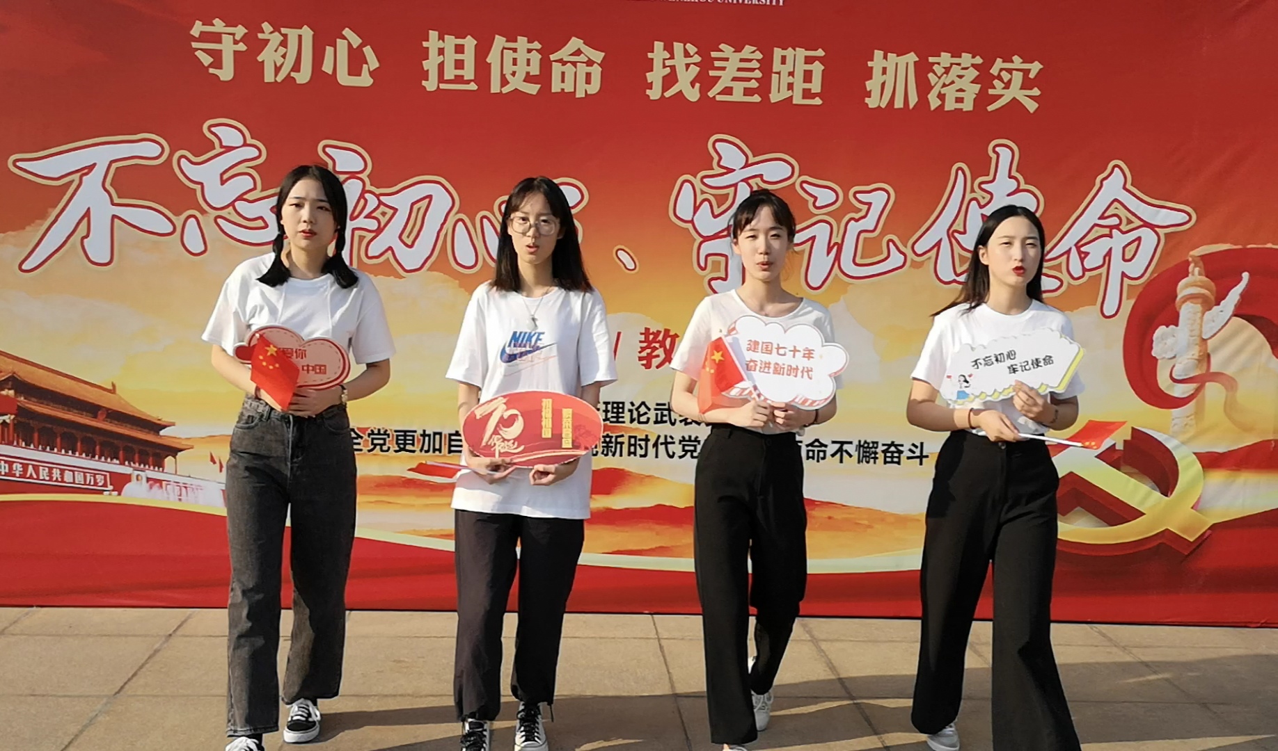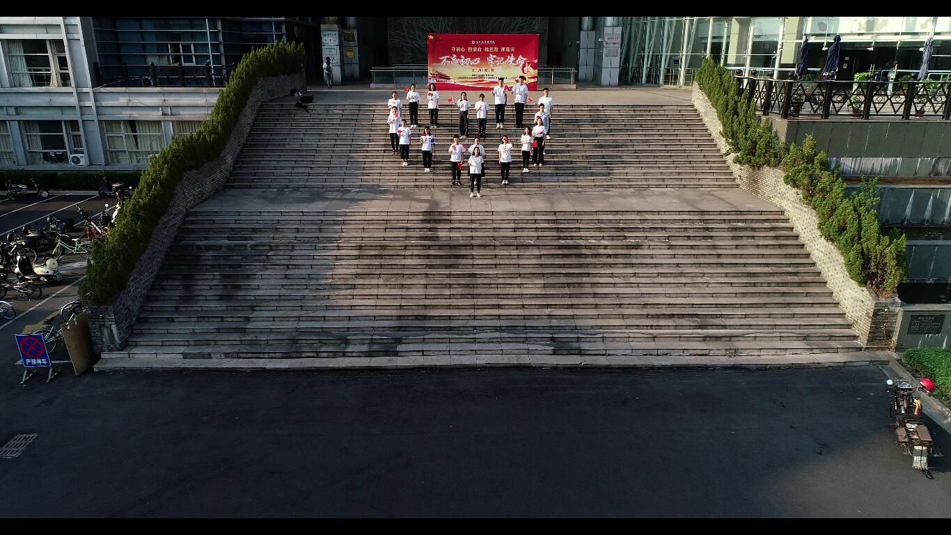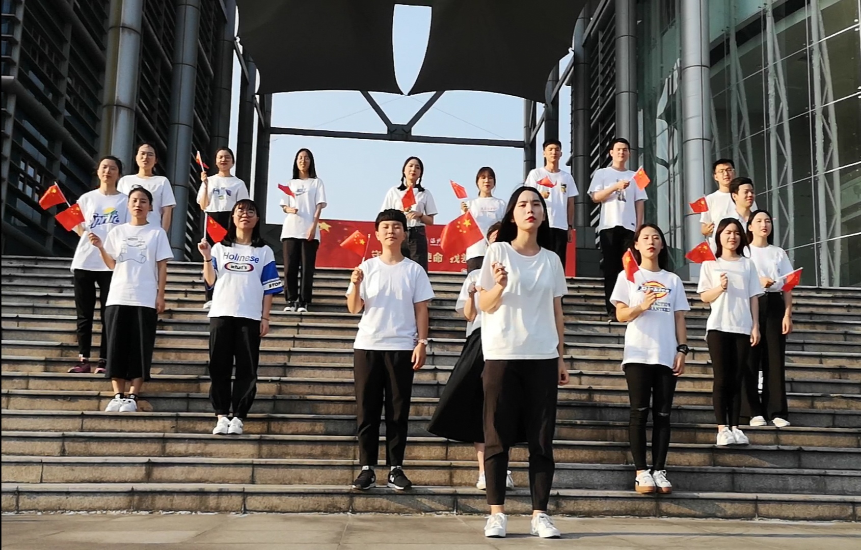 首先,在员工会的协助下,各位党员了解了拍摄主题视频的走位情况。接着,党员们手持着小红旗以及印有“建国七十年 奋进新时代” “我爱你中国”“不忘初心 牢记使命”等字样的宣传牌,由三位女生从商院楼里走出来,四位女生从“不忘初心,牢记使命”主题教育的宣传牌前走出来,再由三位男生从宣传牌另一侧走出来,剩下的党员则在台阶上斜着站成一排,大家开始齐声歌唱《我和我的祖国》。最后,全体党员围成一个爱心的形状,手中挥舞着小红旗,热情澎湃地唱着献给祖国的赞歌。