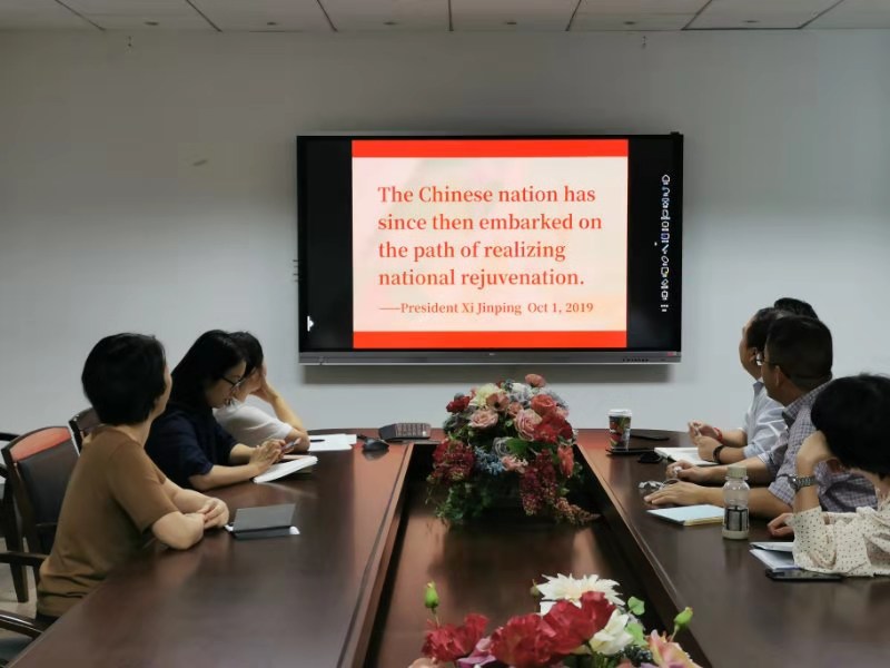 第一部分的参加对象是国际教学部的全体教师(包括党员和非党员教师)。大家首先重新聆听了习近平总书记在国庆大会上的讲话。为了体现国教支部的特色,教师们在聆听讲话之后,对照讲话的英语版,逐字逐句阅读翻译,深刻领会其中蕴含的精神。这一讲话深深激发了各位老师的国家和民族自豪感,大家都表示身为中国人的自豪感。这一讲话既回顾了历史,赞颂了中国过去七十年的发展,又展望了未来,提出了中国后续发展的保障和目标。各位老师纷纷表示,要爱岗敬业,要仅仅围绕教学和科研的岗位核心职能,做好本职工作,当优秀的人民教师。