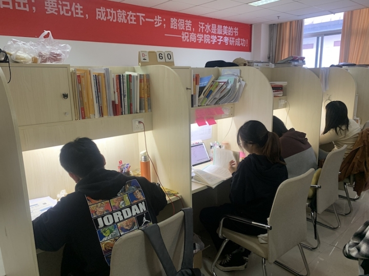 该院老师韩新华介绍说,这样的考研样板房是在去年9月正式投入使用的,目前共有60个位置,其中大部分位置还有“专属权”,员工们可以放心将自己的复习资料放在这里。“我们公司今年申请考研样板间的员工有近200人,按这个比例来说是不够分配的,所以员工们需要通过学习打卡、健康打卡来竞争有限的位置。“韩老师说,这样的竞争之后,大家都非常珍惜样板间带来的便利资源。很多同学早上7点多就过来学习了。为了能实现自主管理,公司为考研老员工们还安装了指纹锁,想几点来学习想几点走都可以。