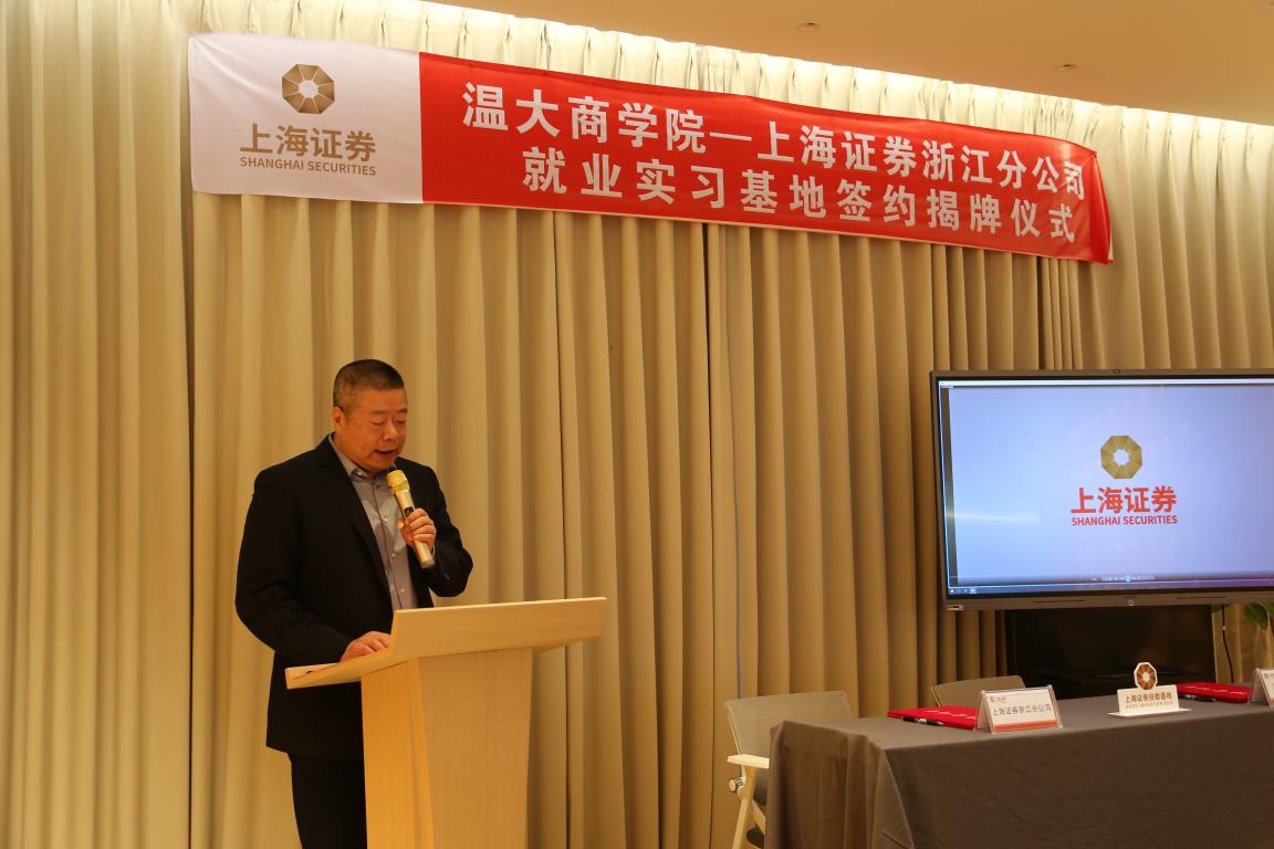 双方在投教基地举行了就业实习基地签约揭牌仪式。上海证券浙江分公司总经理金洛川介绍,上海证券浙江分公司成立于2012年6月,是上海证券在全国范围内组建的首家分公司,同时也是国务院批复设立温州“金改”试验区后在温州区域落户的第一家分公司。下辖浙江辖区22家证券营业部。浙江分公司秉承“开放、包容、规范、协同”的核心理念,覆盖浙江,服务全省,以最佳产品和服务为指引,加大互联网金融实践,不断提升客户体验,为广大投资者提供证券经纪、财富管理、投资咨询等全方位的综合金融服务,努力成为“特色鲜明、区域领先、品牌知名”的优质券商。金洛川总经理希望通过本次就业实习基地的建设,加强双方人才合作,大力开源拓岗。为毕业生就业拓宽新空间,实现人才培养和社会需求的有机结合。