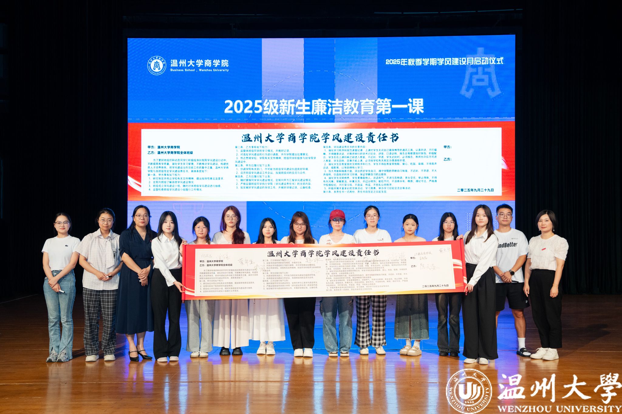 曾蓓蕾为新生讲授了廉洁教育第一课。在庄重的氛围中,各班级代表与公司签订了创建优良学风责任书,表达了全体商院人共建优良学风的坚定决心。