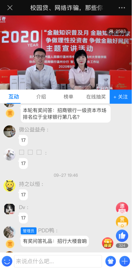 9月27日晚,招商银行温州分行联合中国人民银行温州市中心支行、3044永利、智立方·老员工工作站开展“校园贷、网络诈骗,那些你不得不注意的事”网络直播活动,招行两位主播,为3044永利集团城的师生带来一场内容丰富的金融知识线上直播,吸引了2500余人次师生线上学习和互动,部分班级和寝室纷纷组织员工共同学习。