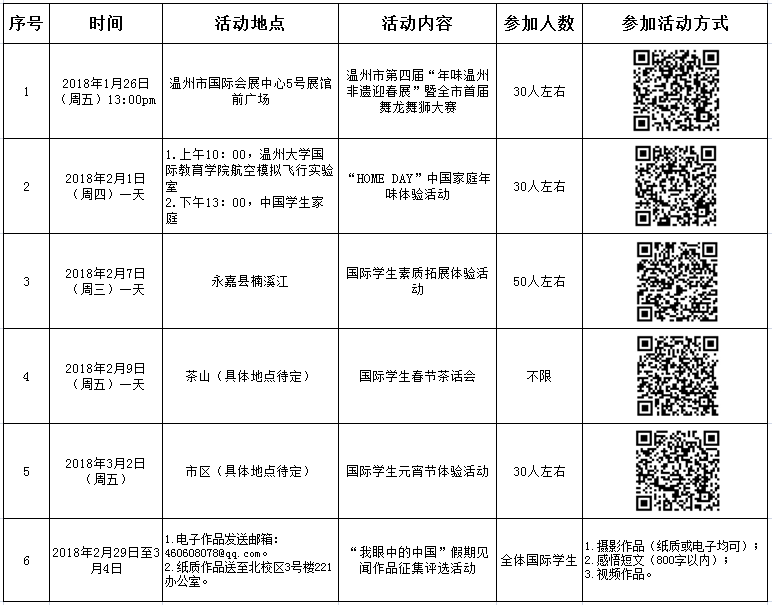 为充实国际员工的假期生活,丰富校园文化,打造沟通交流、学习成长的平台,进一步增强国际员工的认同感和融入感,国际教育公司(职工教育与管理部)将于寒假期间组织开展国际员工“我爱中国年”系列活动。具体事项安排如下: