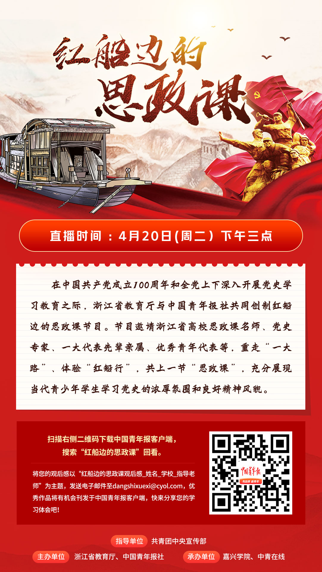 直播时间:2021年4月20日(周二)15:00至16:00,直播地址:中国青年报App客户端(进入客户端搜索“红船边的思政课”,客户端、PC端直播链接http://news.cyol.com/gb/live/articles/2021-04/15/content_KEVGmHBbA.html);“教育之江”微信公众号、浙江高校网络思想政治工作中心、“之江汇”教育广场等平台将提供相关观看渠道。