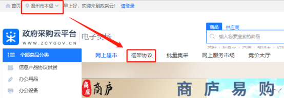 培训服务供应商可在政采云(https://www.zcygov.cn)的“框架协议”栏目中查询,查询时注意左上角地域设置为“温州市本级”(见下图)。