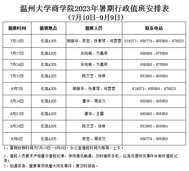 2023年暑期行政值班安排表