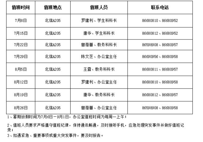 2024年暑期行政值班安排表