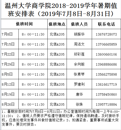 2018-2019学年暑期值班安排表(2019年7月8日-8月31日)